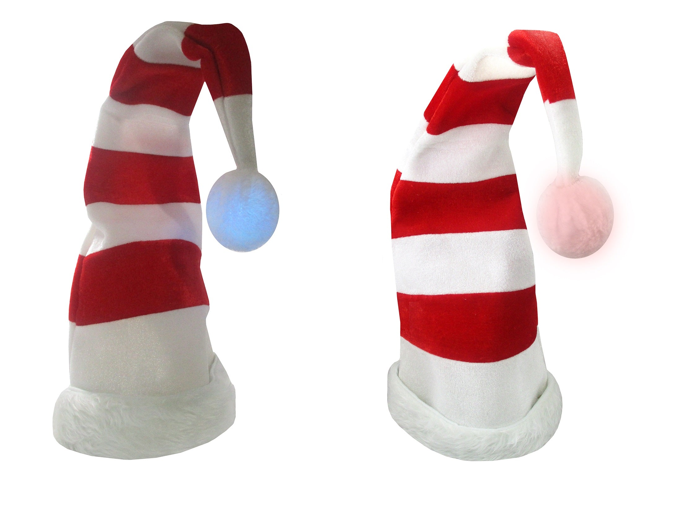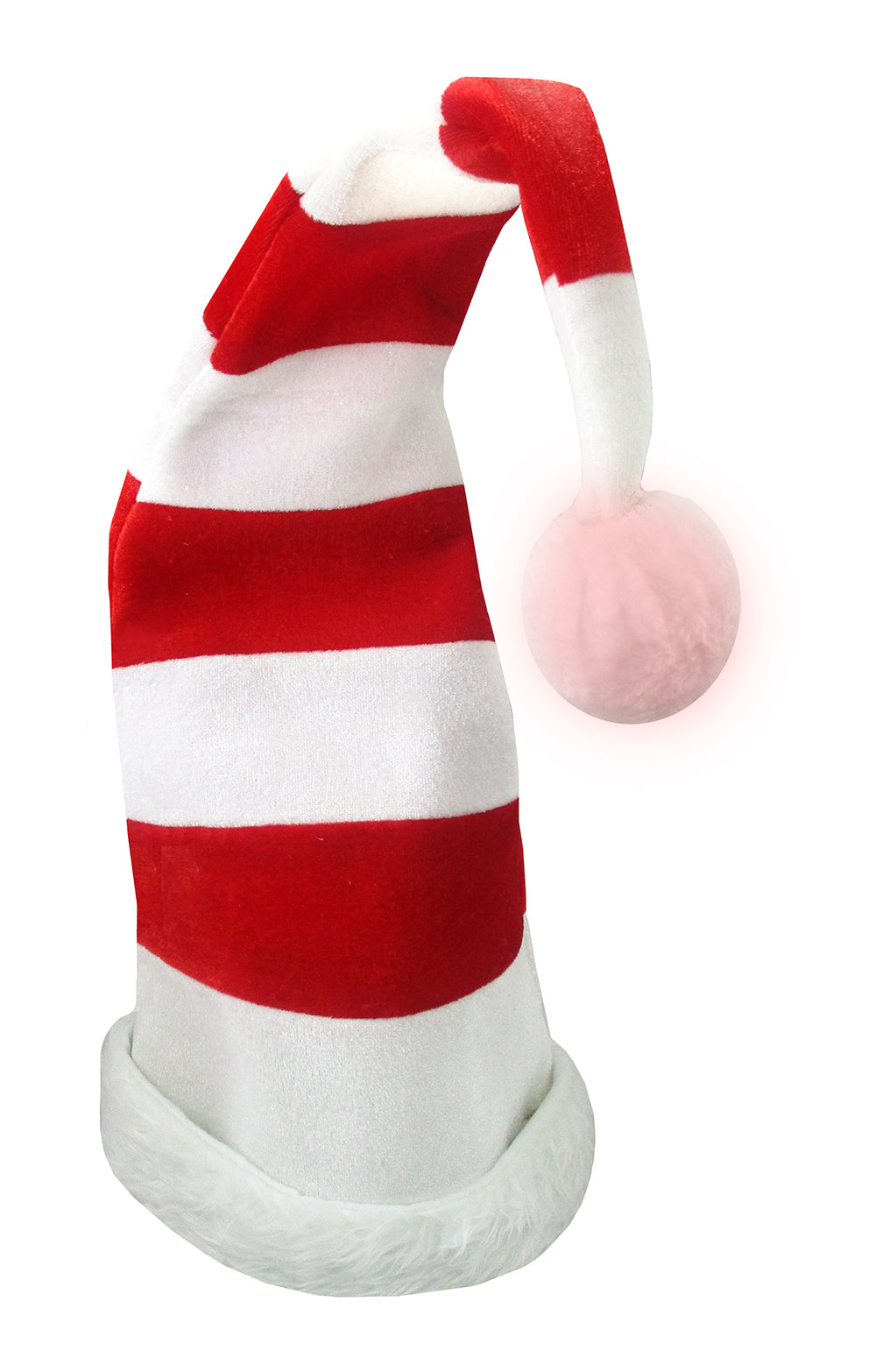The bold red-and-white candy stripe design mimics a giant peppermint swirl, while the color-changing LED pom pom brings it to life. Simply press the discreet button to cycle through the vibrant glow thatâs sure to turn heads at any holiday party, office event, or photo booth.