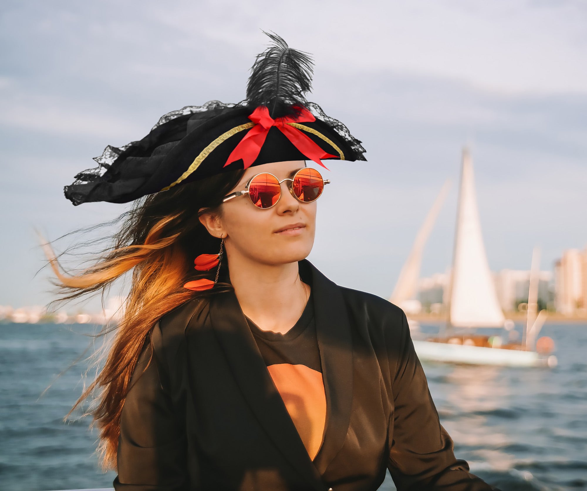 - Womens Red and Black Gold Trim Pirate Hat with feather is perfect for Halloween, Cosplay, Theater and more! Great for Adults and Teens!