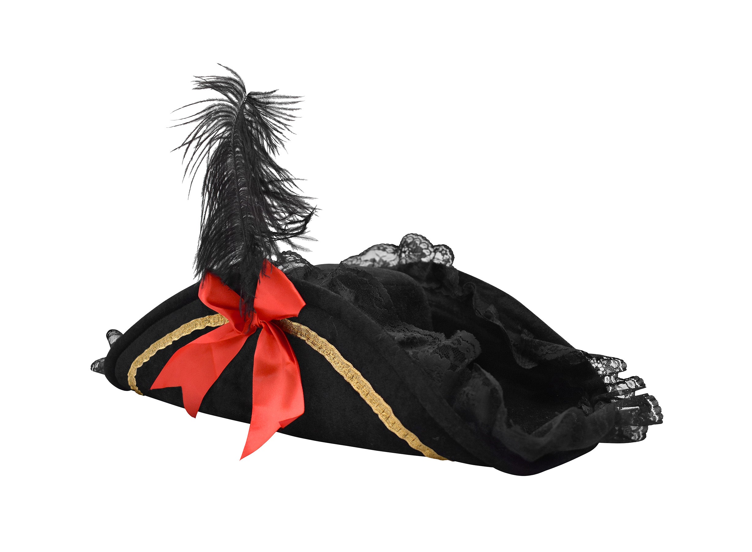 - Womens Soft Black Swashbuckler Lady Pirate Hat. Features a soft polyester hat with a velveteen look that has black lace trim, a gold ribbon trim, a black fake feather and accented with a red bow on both sides.