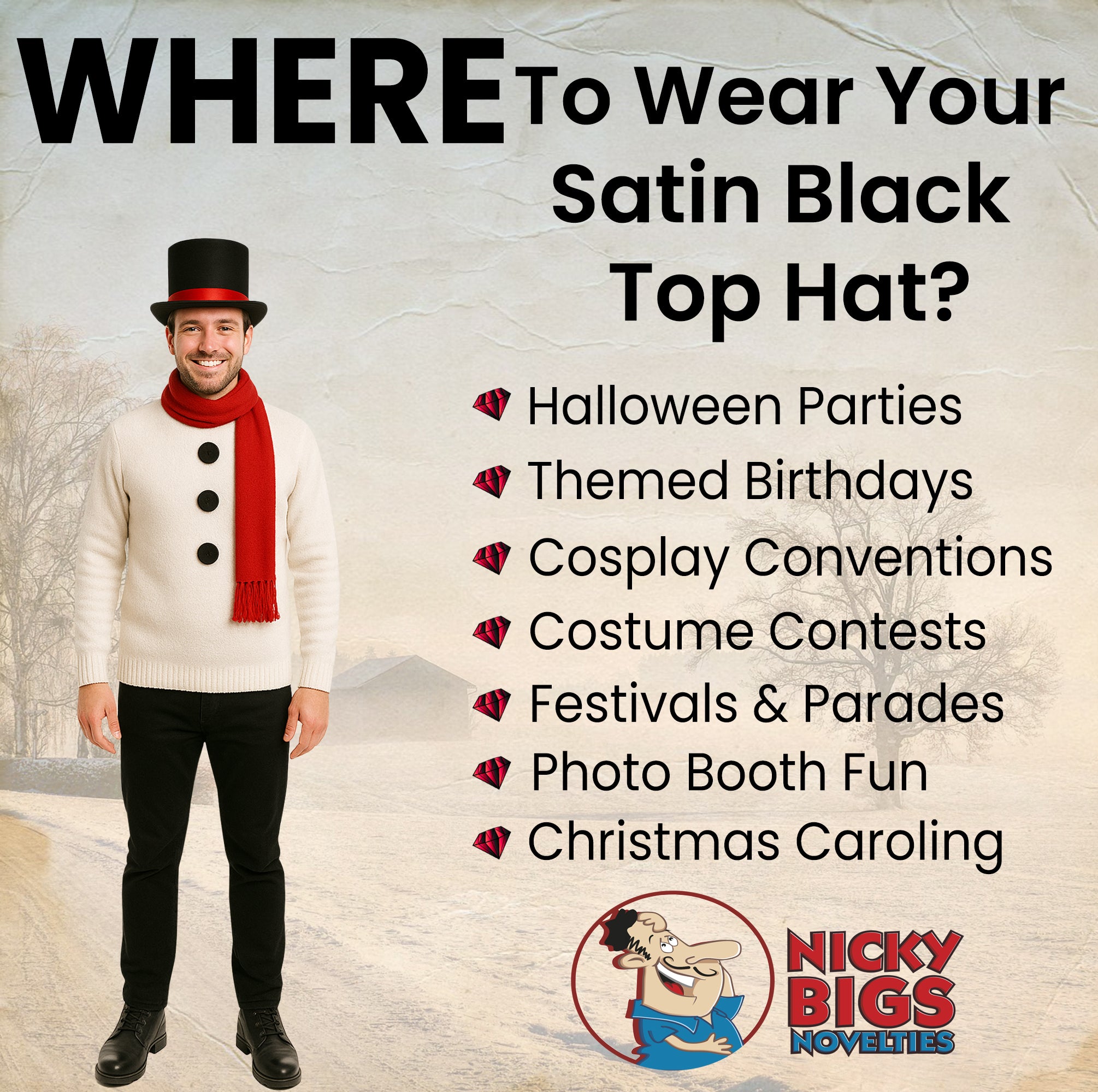 Step into character with the iconic Nickyâ€Bigs Novelties Black Satin Top Hat with Red Band, proudly designed by the American familyâ€owned Marsinos Costumes—boasting over a century of costume artistry. This elegant headpiece pays homage to classic style, pairing luxurious, soft black satin with a bold red ribbon for a striking, highâ€contrast look that instantly amplifies your costume.