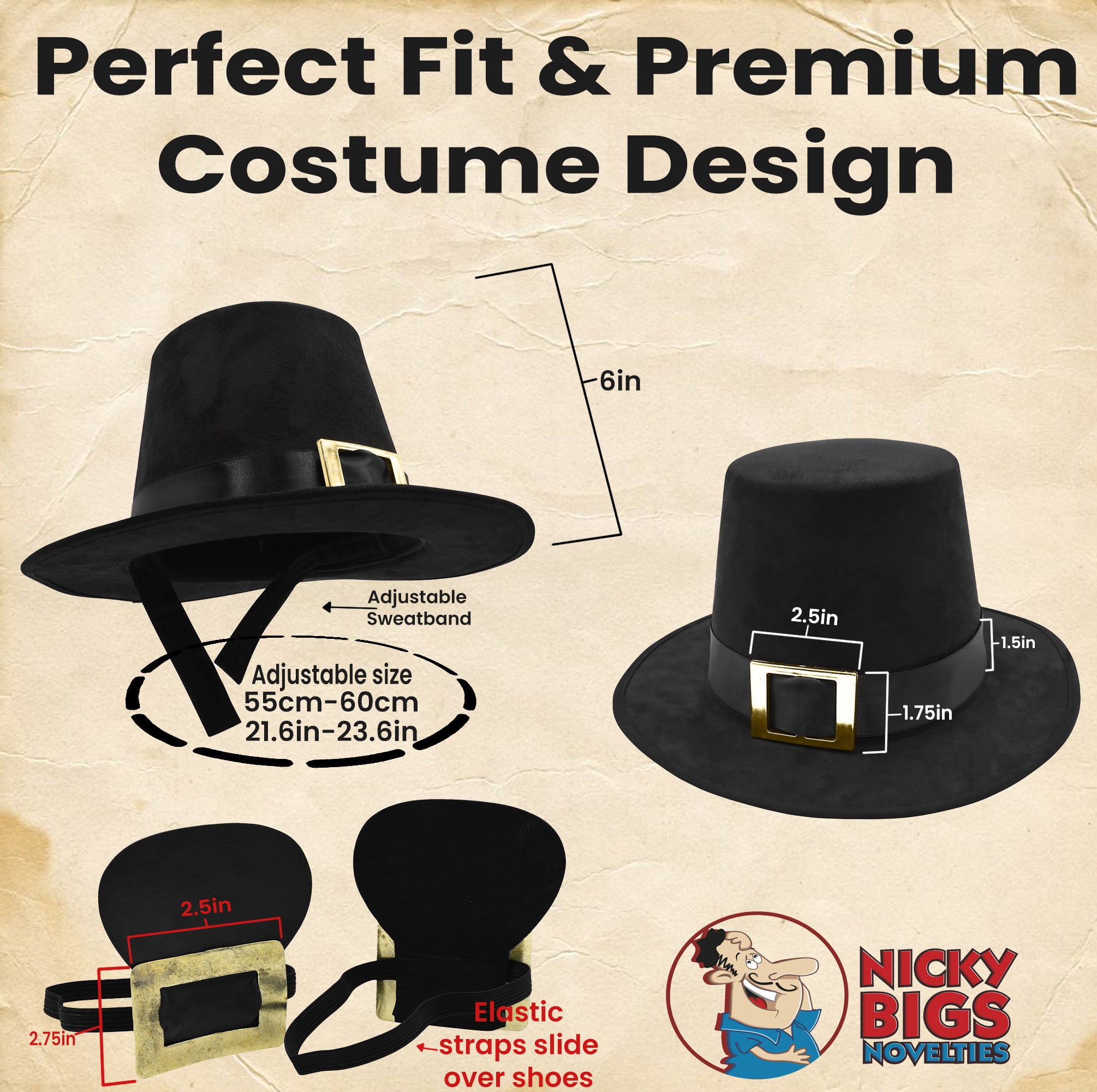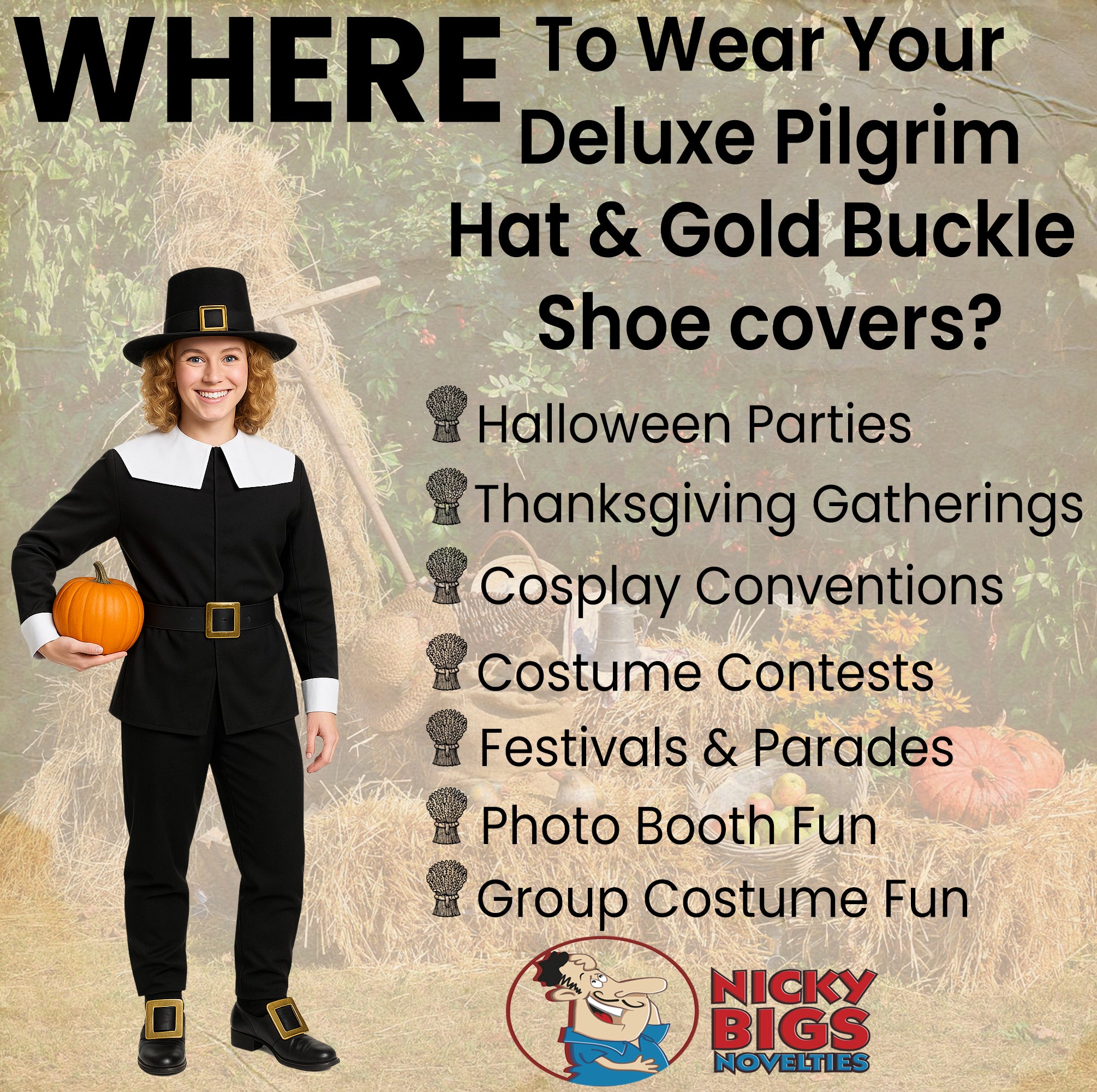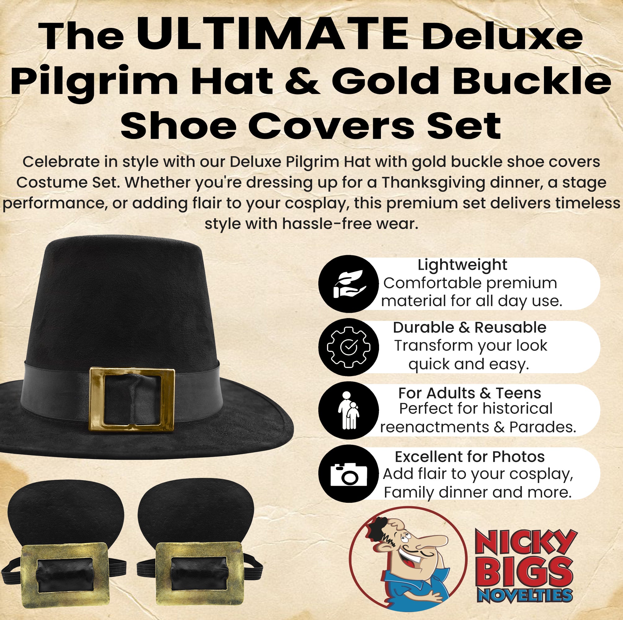 Celebrate Thanksgiving in true colonial style with the Nicky Bigs Novelties Deluxe Pilgrim Hat and Gold Buckle Shoe Covers Set, brought to you by Marsinos Costumes—a USA-owned, family-run brand with over 100 years of heritage in costume design.
