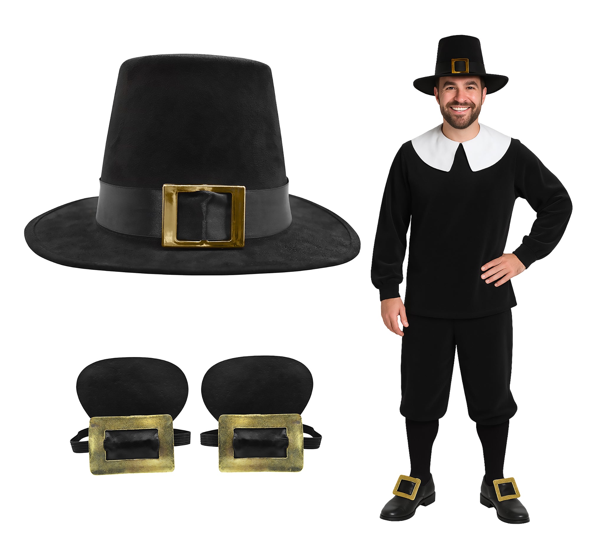 • Complete Pilgrim Look- Includes a classic black pilgrim hat with gold buckle and matching gold buckle shoe covers—perfect for Thanksgiving, cosplay, theater, or school plays.