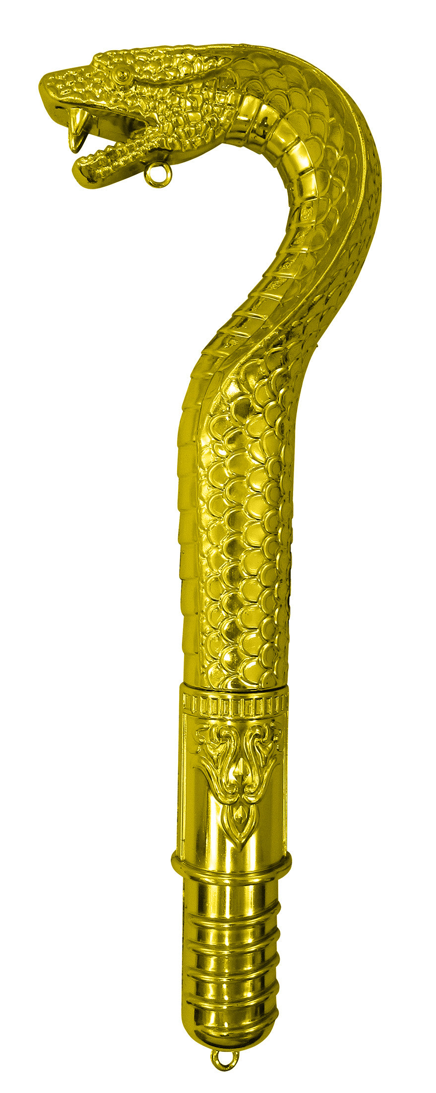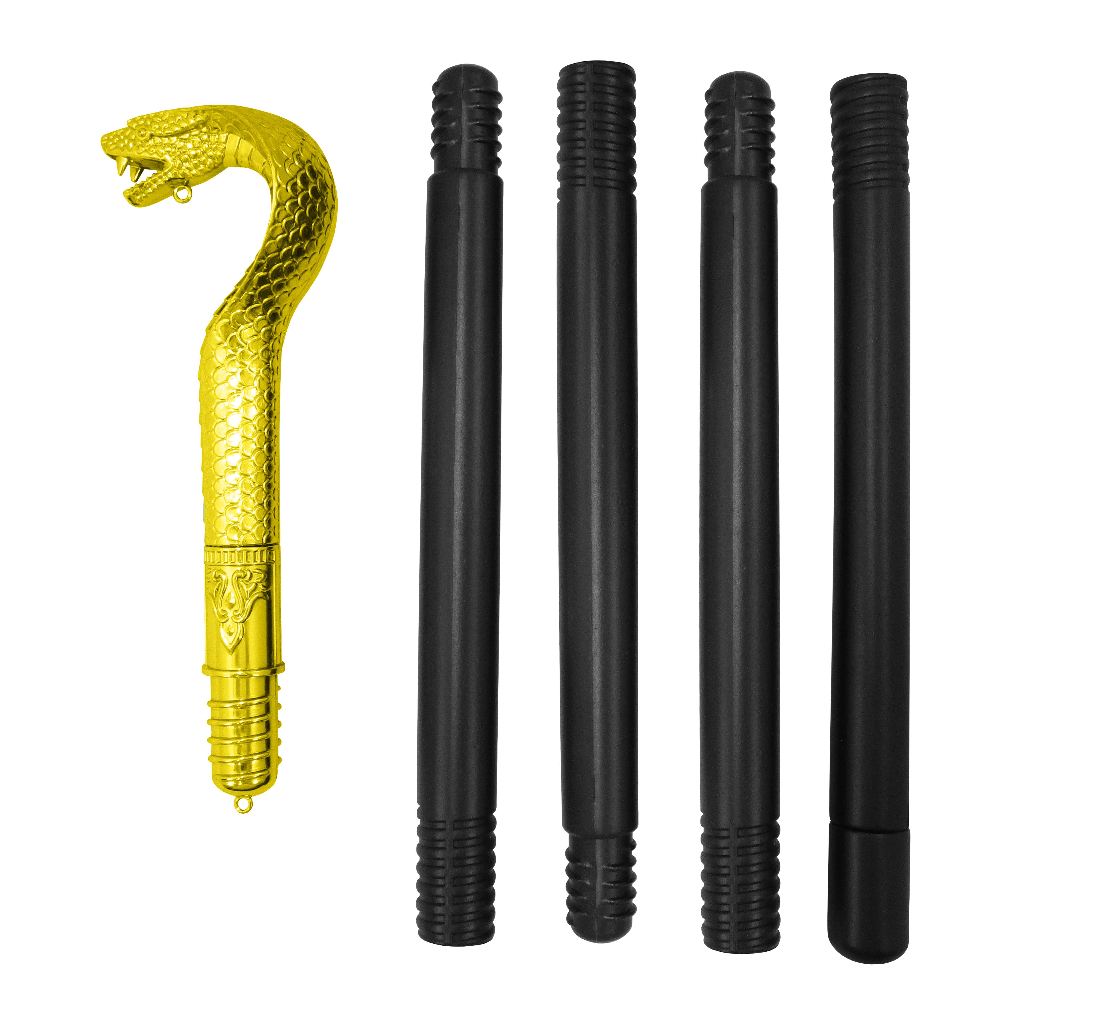 Experience the allure of ancient Egypt with the Pharaoh Staff from Nicky Bigs Novelties. Choose from All Gold or Gold and Black. This 5 piece hollow and lightweight staff is a timeless symbol of power and authority, making it an ideal accessory for any Egyptian inspired costume. Recreate the mystic aura of the pharaohs with our 49 inches tall Egyptian scepter, which features a striking snake head, reminiscent of the cobra cane carried by Egyptian. This cobra staff is not just a prop, but a statement of grandeur, making it a perfect addition to any King Tut or Cleopatra ensemble. Our Egyptian stick also makes a fitting cartoon enthusiasts. Whether you're using it as a Halloween staff cane, a snake walking stick, or as a part of your Egyptian staff costume accessory, the allure of this gold staff prop is undeniable. The staff can also be used as a standalone piece, adding a touch of charm to your home or office decor. The Egyptian cane can be dismantled into 5 pieces for easy storage and transport. Crafted with impeccable attention to detail, the snake cane embodies the essence of Egyptian mythology. The snake staff is also a great prop for stage plays, theme parties, and photoshoots. With our Pharaoh staff, you can bring the world of the Egyptian pharaohs to life. Nicky Bigs Novelties is committed to providing high-quality products that inspire creativity and fun. Our Egyptian staffs are the perfect blend of authenticity and playfulness, making them a must-have for Egyptian, snake, cobra, pharaoh, stick, scepter, Cleopatra, walking, king, tut, pharaoh, staffs, costume, accessory, Halloween, gold, and prop enthusiasts alike. For ages 14 and older.