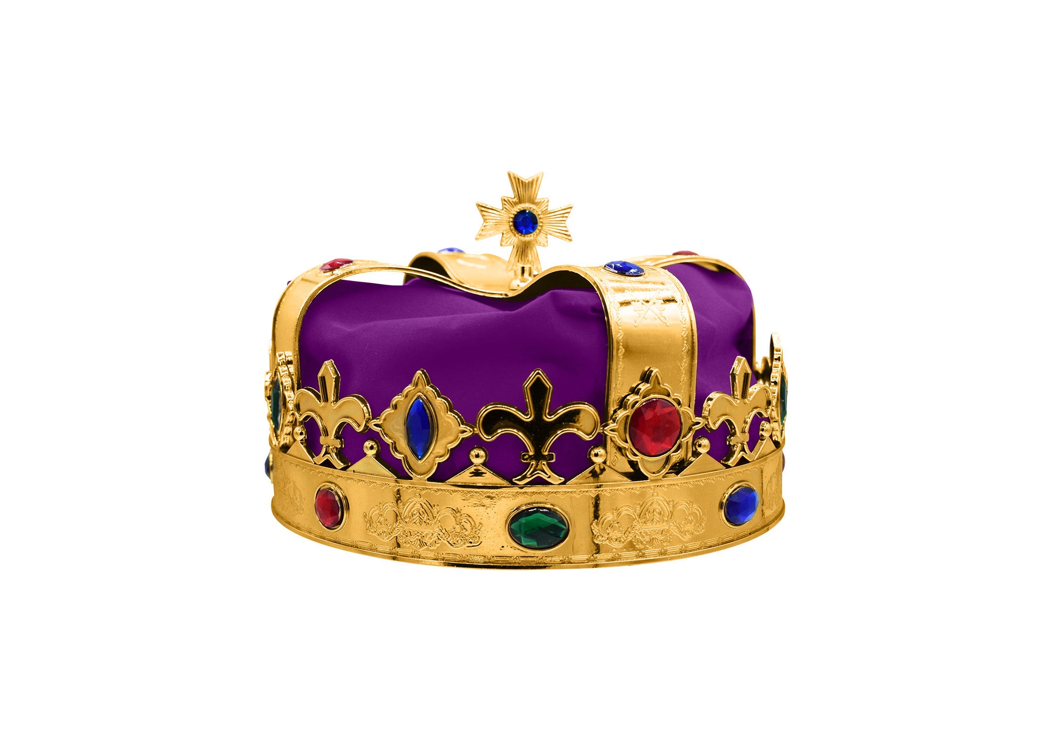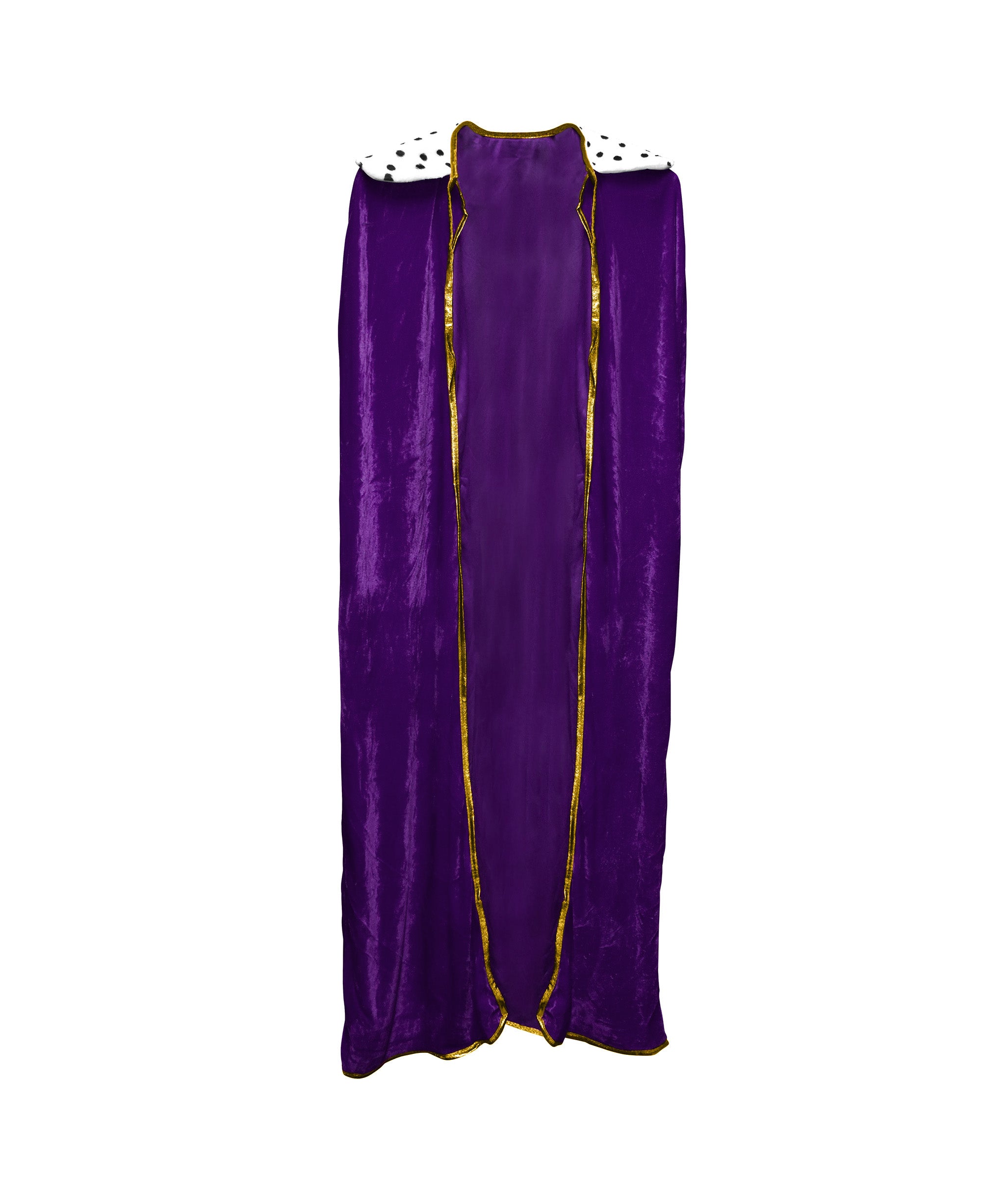 - Unisex Adult King or Queen Robe featuring a white spotted faux fur collar and a matching Gold Crown accented with faux gems. Choose from Red/Gold or Purple/Gold.