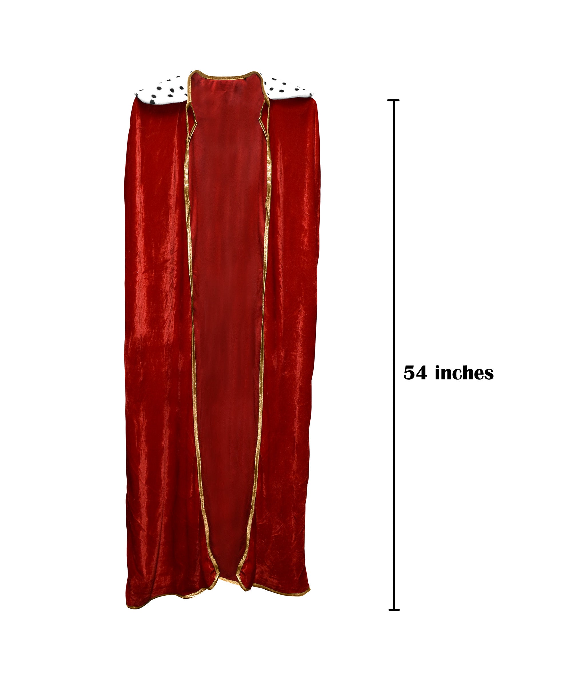This season complete your look with this Unisex Adult King or Queen Robe featuring a white spotted faux fur collar and a match Gold Crown accented with faux gems. Choose from Red/Gold or Purple/Gold. Perfect for Halloween, Cosplay, Theater, Photo Booth Props and more! Each velveteen robe is in a royal red featuring a gold trim and neck tie, with a white collar with black spots to look like a Dalmatian. Each hat fits approximately 55 cm, featuring a foam insert to rest comfortably on top of the head. The crown is about 5.5 inches tall with the top cross included in the height and 7.5 inches wide. Great for Kings and Queens in all courts! Each cosplay robe is lightweight and hangs about 54 inches long. Spot Clean only. Line Dry. For ages 14 and older.