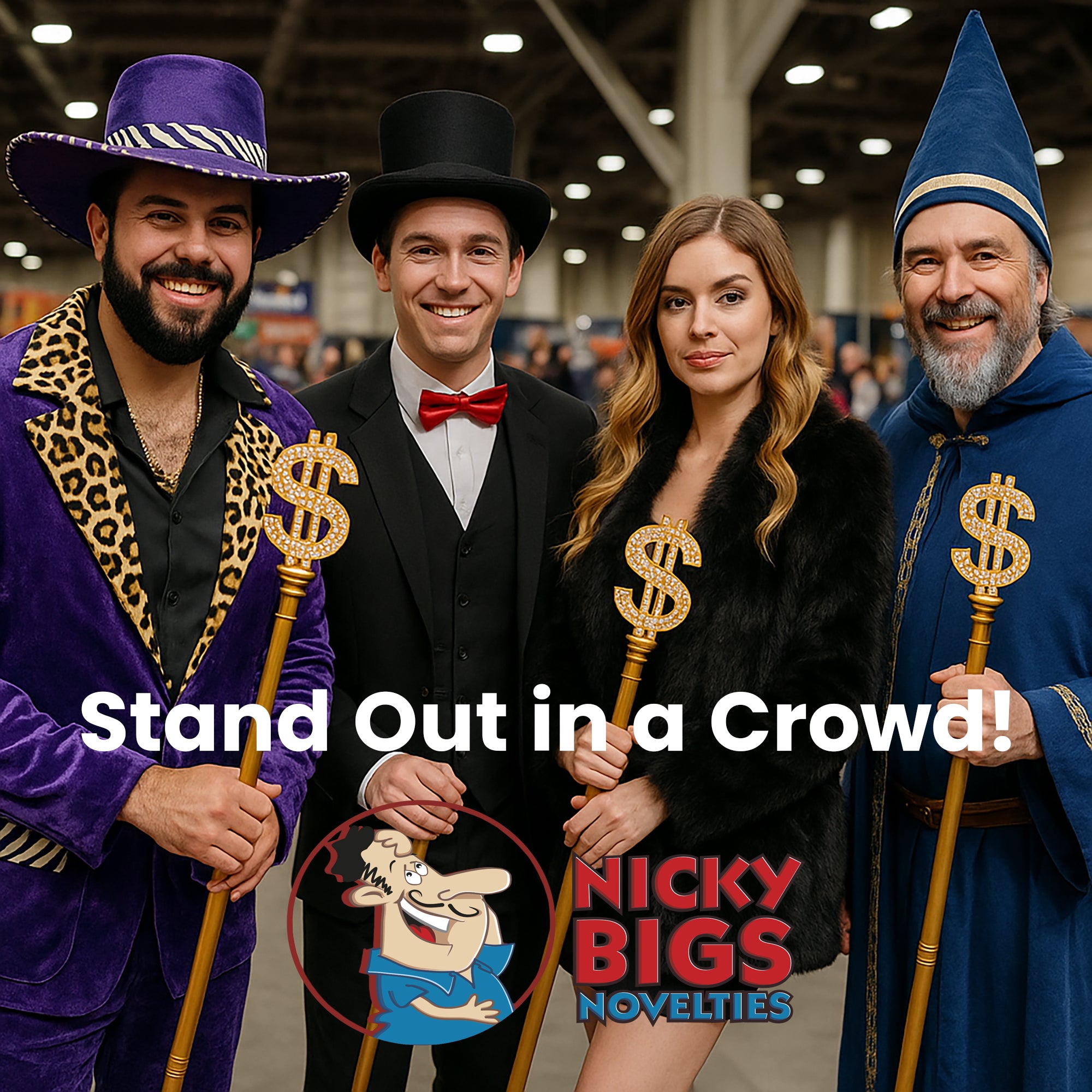 - Bold Dollar Symbol Cane Make a statement with this flashy gold cane featuring a sparkling dollar sign encrusted with faux jewels. Whether dressing as a high-rolling gangster, theatrical magician, or eccentric kingpin, this eye-catching accessory adds humor and style to any outfit or themed event.