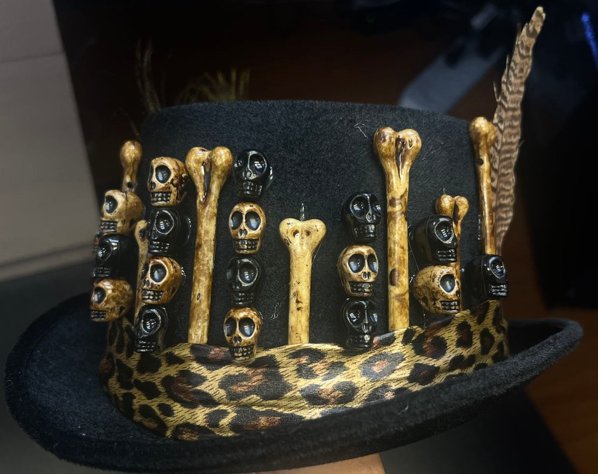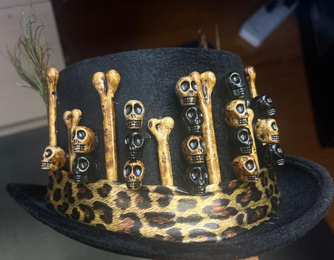 - Novelty hat features mini skulls and fake bones, fake feathers and a pretend leopard print scarf band.