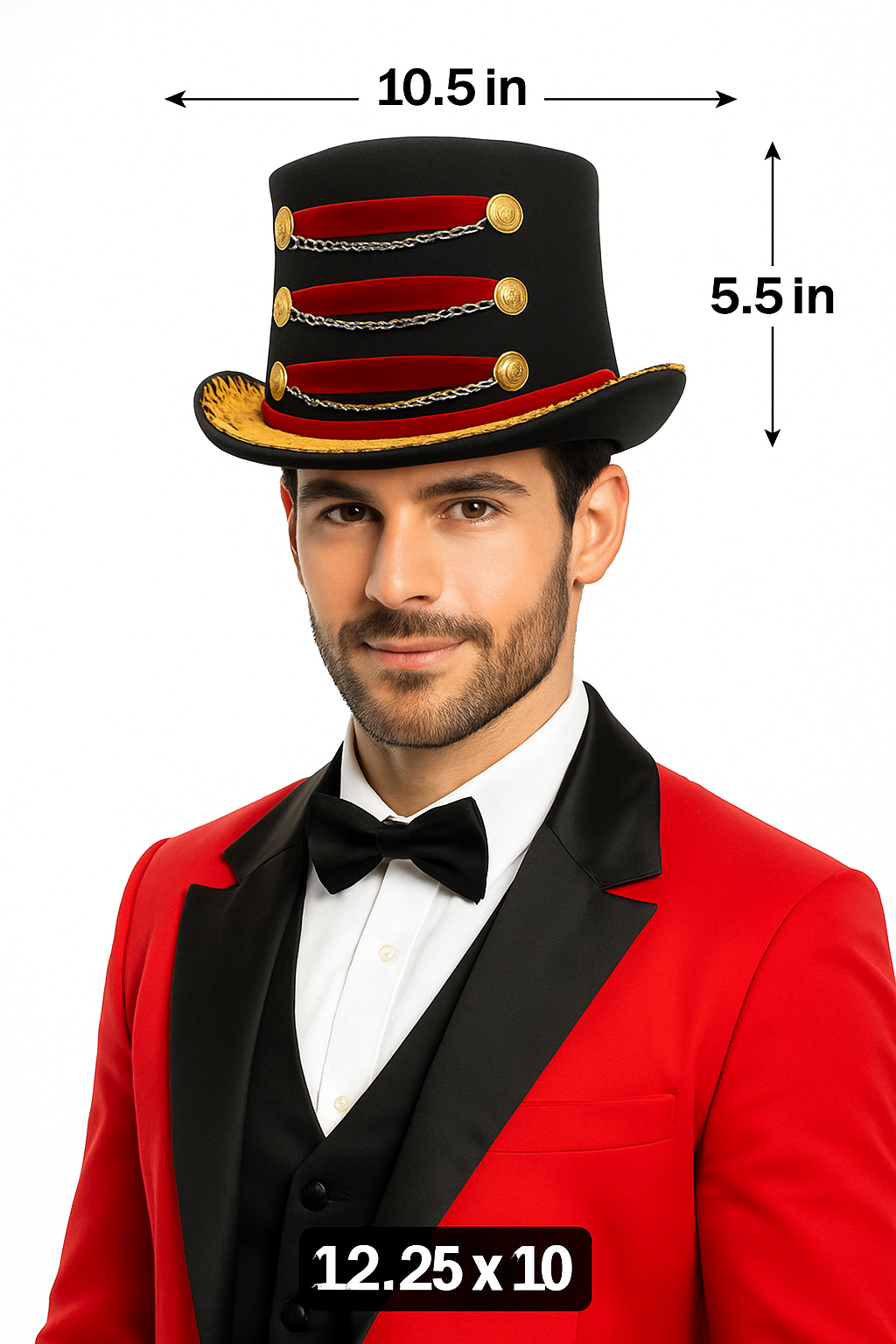 It's Circus time and you are the Ring Master! This season complete your look with this Deluxe Red and Black Ringmaster Top Hat. Perfect for Men, Women, and Teens! This deluxe Ring leader top hat is the perfect addition to your Circus themed party costume. The dark ring master hat has gold fringe accenting around the base of the hat, three red strips of velveteen fabric accented with gold buttons on either side, and silver chains dangle to complete the front look. The big top top hat is approximately 5.5 inches tall and includes a sweatband for a customized and comfortable fit. Sized about 52 cm - 58 cm in diameter or 20.4 inches - 23 inches, each circus hat is about 12.25 inches long and 10.5 inches wide. Great for Halloween, Cosplay, Theater, and more! One size fits most. For Ages 14 and Older Great for Halloween, Cosplay, Theater, Carnivals, Festivals and more! Spot clean only.