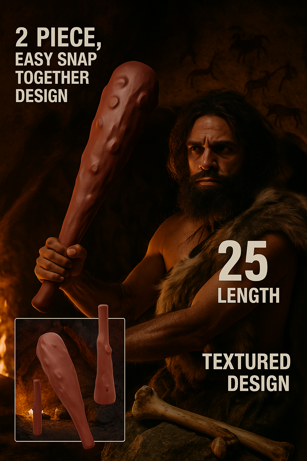 Introducing the latest addition to the Nicky Bigs Novelties collection, the cartoon inspired Caveman Club. This 2-piece set is a must-have for all cartoon fans and cosplay enthusiasts. Our Caveman Club is a perfect accessory of the iconic caveman look, bringing the Stone Age right to your doorstep. At 25 inches long, this caveman club prop is specifically designed to be lightweight and hollow, making it easy to carry around for any occasion. Whether you're dressing up as your favorite cartoon or simply adding to your collection of caveman accessories for men, this club will surely add an authentic touch to your ensemble. The design is versatile enough to be used as a caveman stick or a caveman bat, depending on your preference. Our cavewoman club is an excellent prop for costume parties, themed events, or theatrical productions. It's also a fun accessory for photo booths at weddings or corporate events. The detail and craftsmanship of this cave man bat lend itself to being an outstanding piece of decor in a man cave or a themed room. The Nicky Bigs Novelties Caveman Club is a versatile prop and accessory that will undoubtedly enhance your decorations or caveman-themed costumes or events. It's a fun and unique way to bring the Stone Age to life, whether you're using it as a prop or just as a piece of decor. So, why wait? Grab your caveman club today and step into the world of Fred Flintstone and his classic Stone Age crew. Remember, the club may be hollow, but the fun is full to the brim! For ages 14 and older. *Prop only, not to be used as weapon*