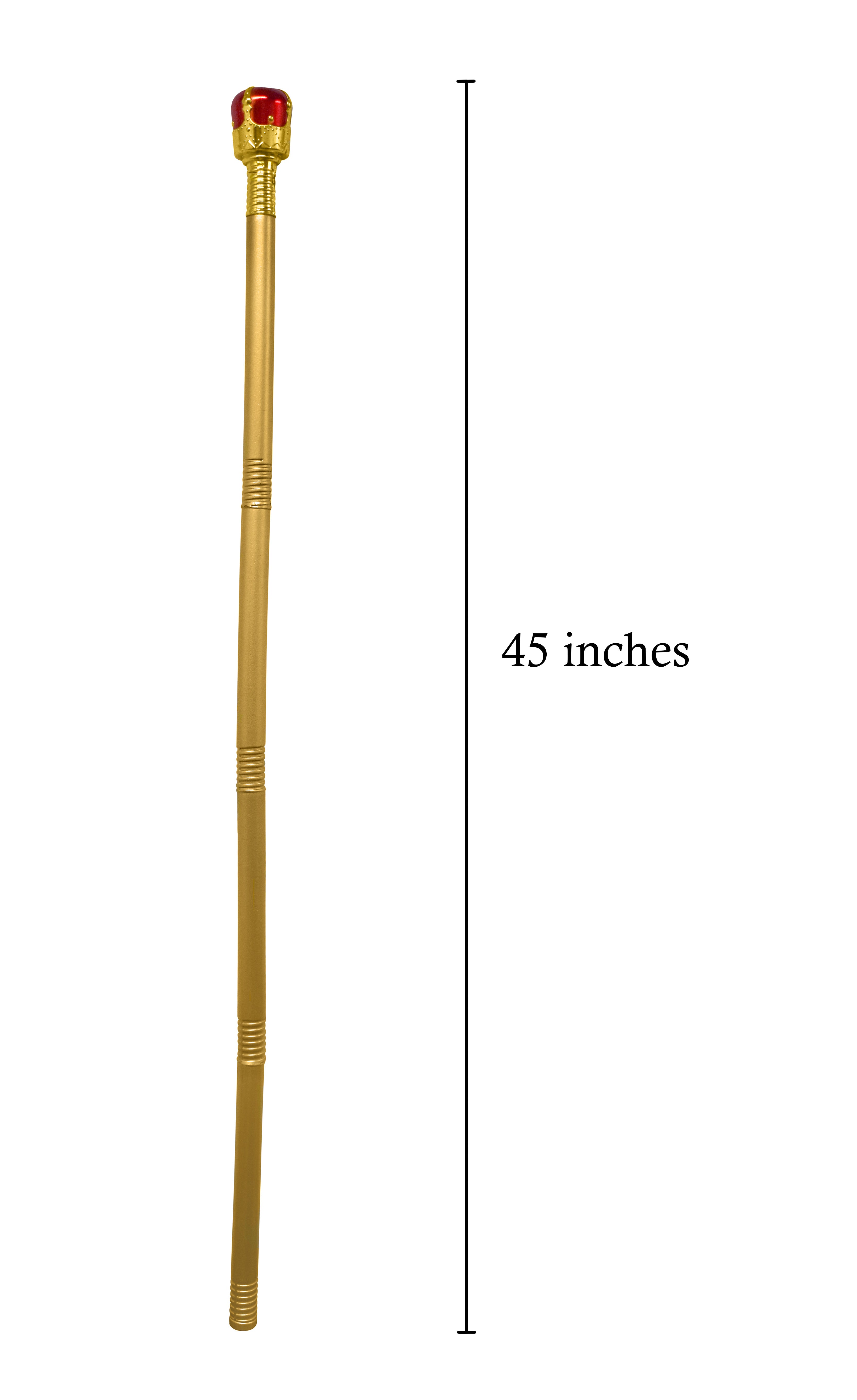 You'll have servants kneeling before you with this royal scepter. Perfect for a King or Queen. Complete your look this season with our Gold Royal Scepter with a Red Crown topper. Great for Cosplay, Halloween, Theater and more. Made of Hollow Plastic and features a easy break down design for east storage. Each cane is 45 inches tall and includes 4 staff sticks and a topper. Staff can be adjust in length by taking away one or two of the inner staff sticks.