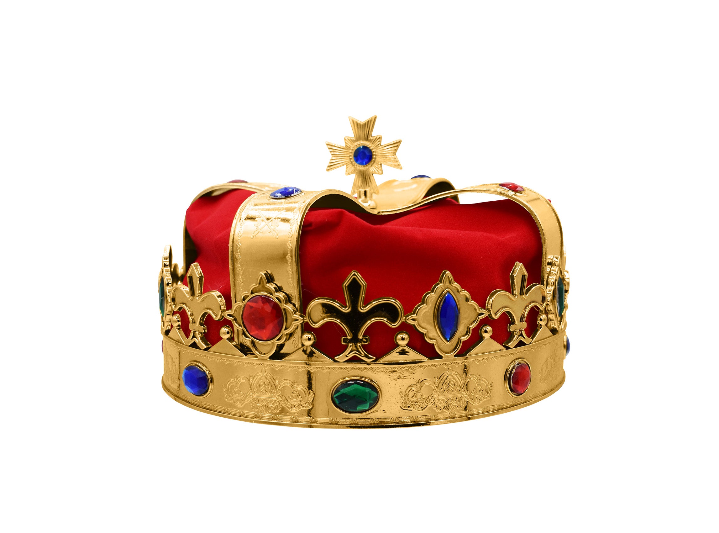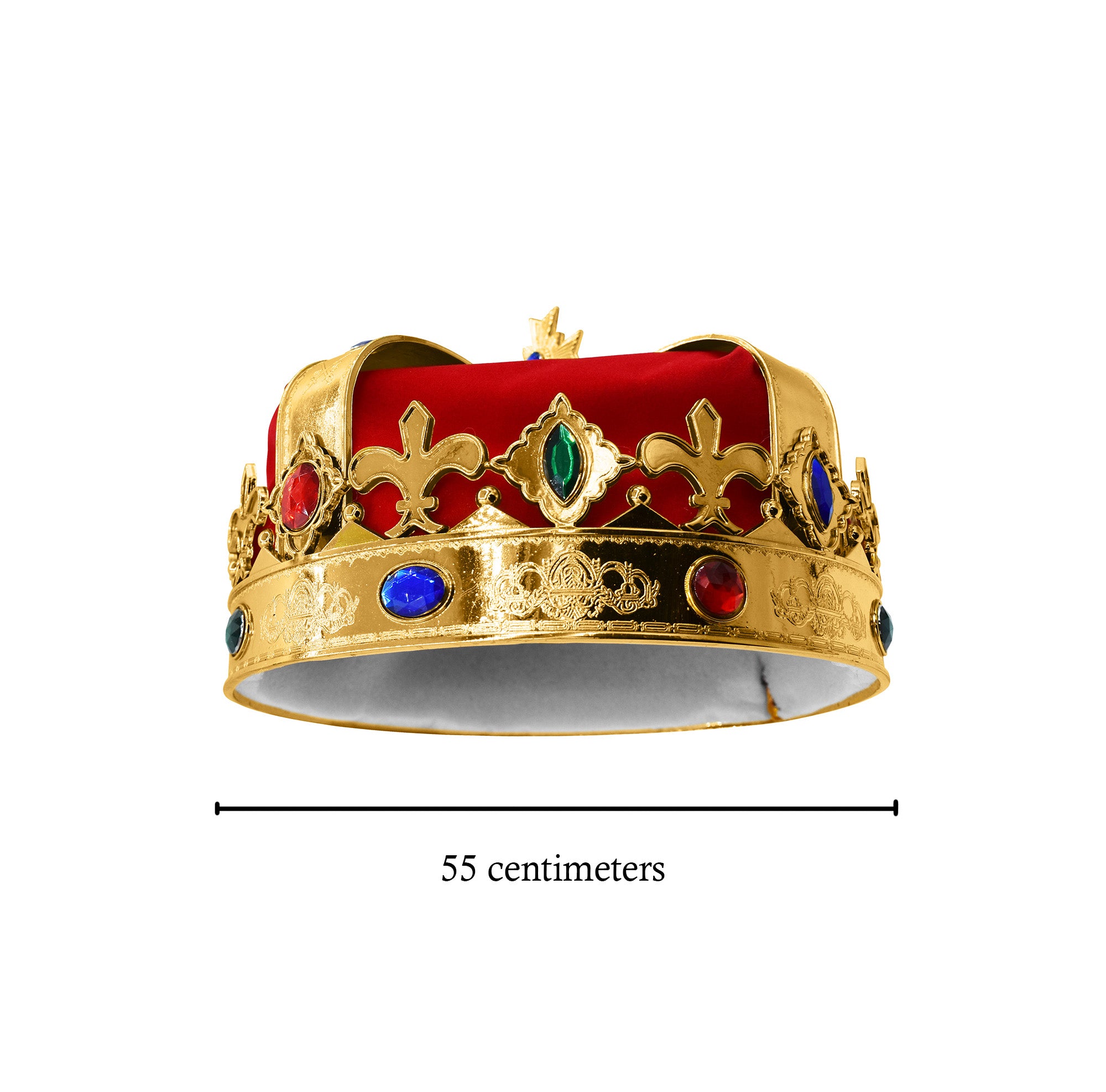 Party Royalty! Complete your outfit with this Adult King Crown and scepter. Featuring a gold plastic crown with a velvet like fake fabric inlay. This royal crown features fake jewels that accent the whole golden crown. From Prom to Homecoming this regal crown is perfect for Teens! Each fake crown fits about 55 cm or 21.6 inches in circumference and features a comfortable foam insert that rounds the inside. Allowing the red crown to rest just on top of the head. Great for Men and Women, this crown hat stands about 5.5 inches tall and is adorned with a gold jeweled cross on top. The crown prop is 7.5 inches wide. Excellent for Cosplay, Theater, Photo booth accessories, Halloween, and more! Pair with our king's red robe to complete the look. Sold Separately.