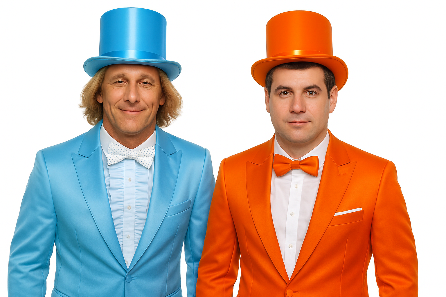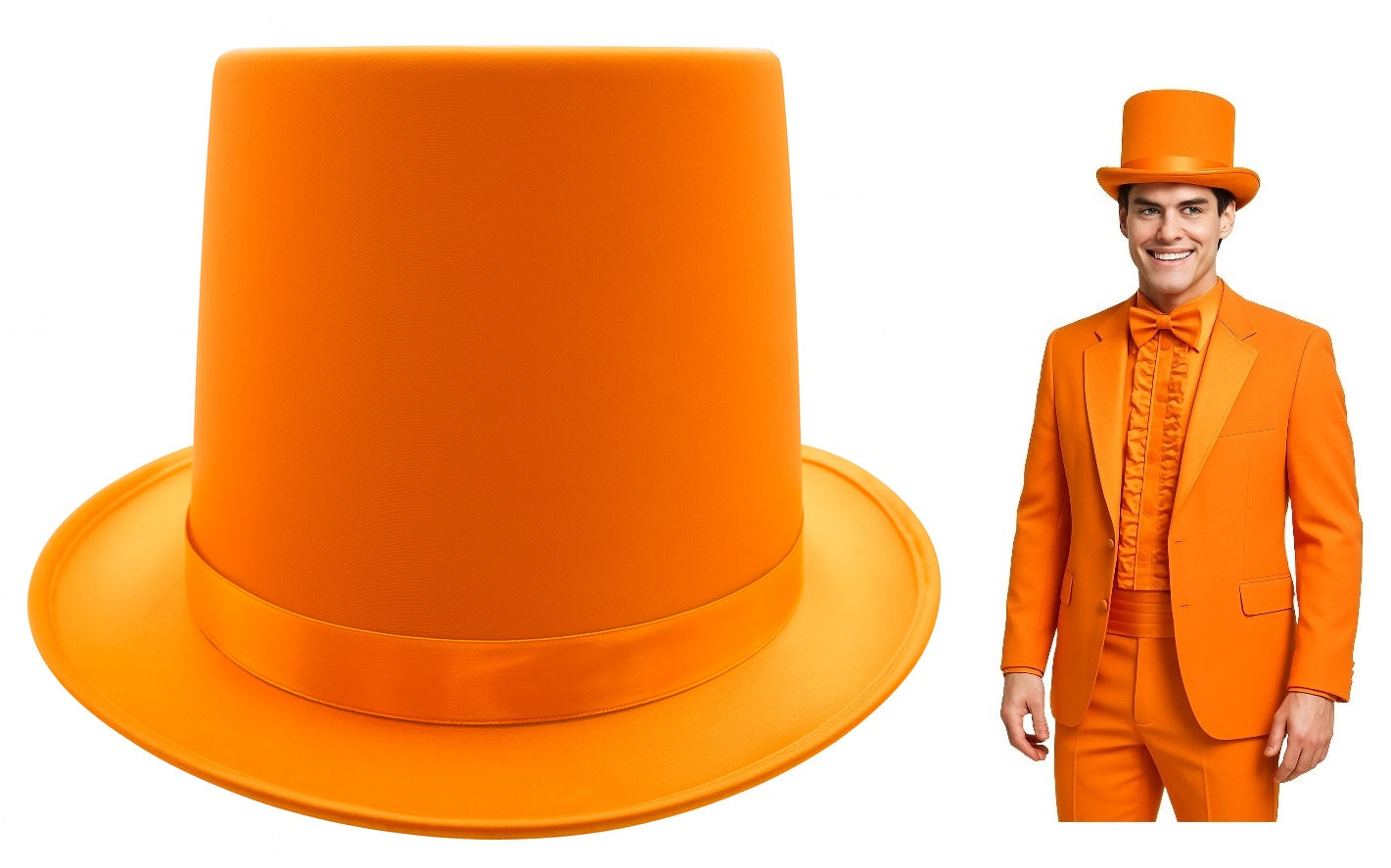 Bring iconic comedy to life with the Nicky Bigs Novelties high quality hard silk like Satin Top Hat Set. Inspired by one of the most legendary comedic pairs in cinema history, this set includes one bright orange and one vivid blue top hat each made from durable EVA foam with fabric cover and featuring a coordinating satin ribbon band for a polished, picture-perfect look.