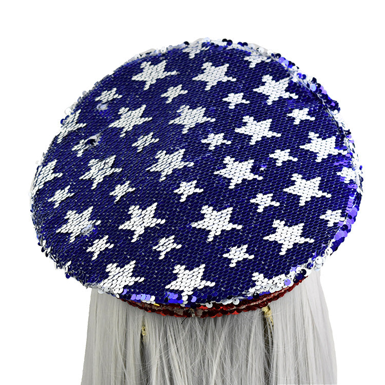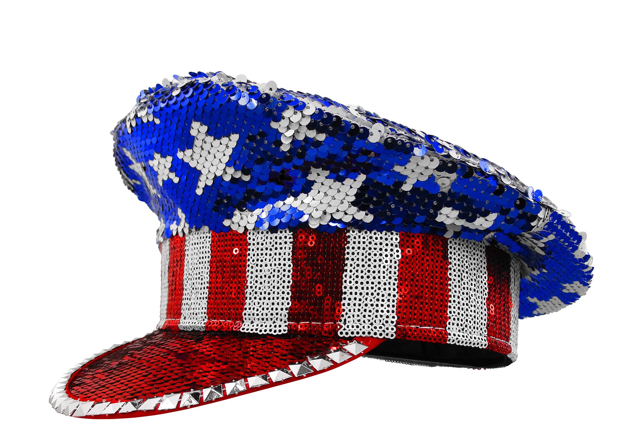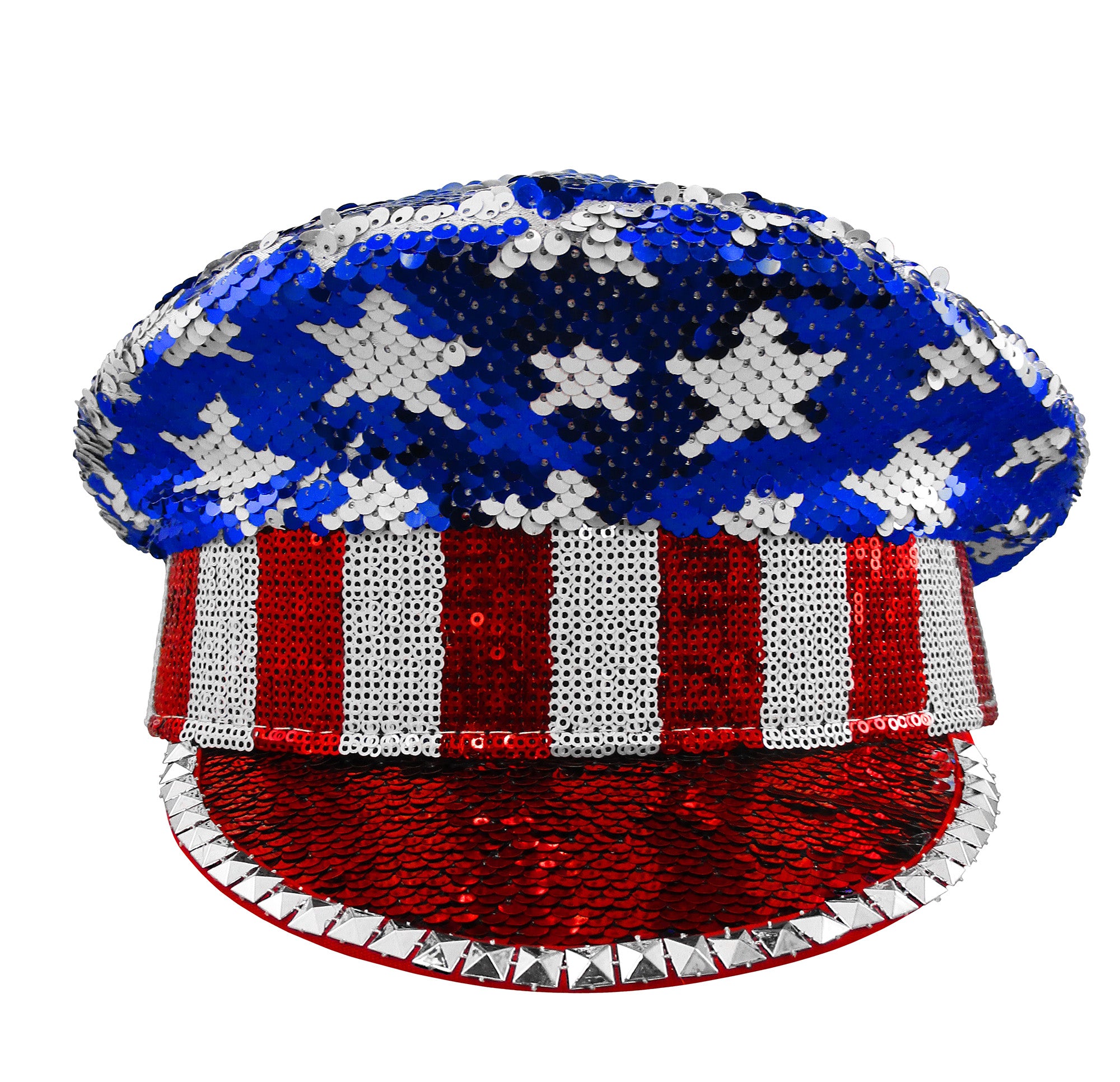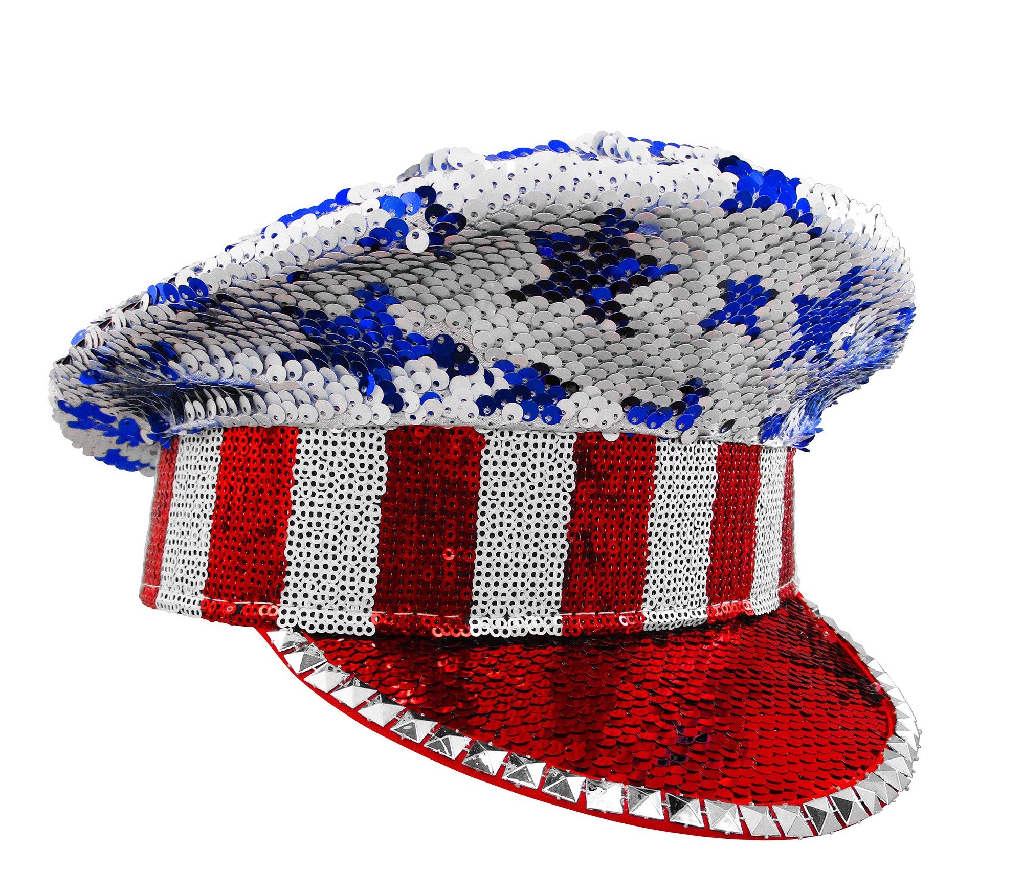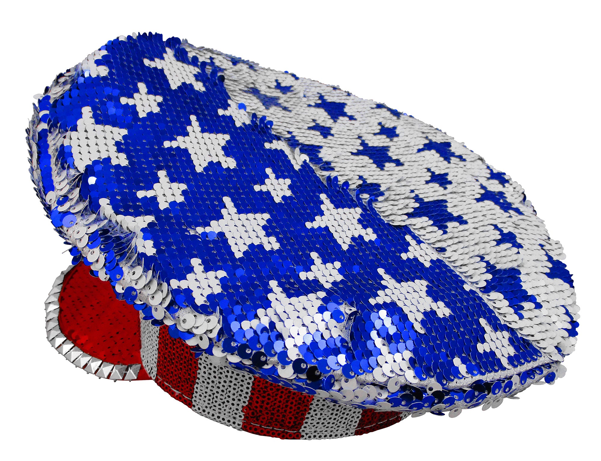Sparkle, shine, and strut your fabulous self in this stunning color changing iridescent hat. Adorned with gorgeous faux gems and color changing sequin. One size fits most up to 58cm or 22 inches. Great for festivals, Halloween, every day wear, and more. Select from Black Iridescent Flip Sequins, White Iridescent Flip Sequins, Silver Bride with Gems, Rainbow with Studs, Dark Blue Chameleon with Studs, or Patriotic with Studs. Great for festivals, Halloween, bachelorette wedding party bride to be, beach hat, night club, bar crawl, pub crawl, every day wear, and more.