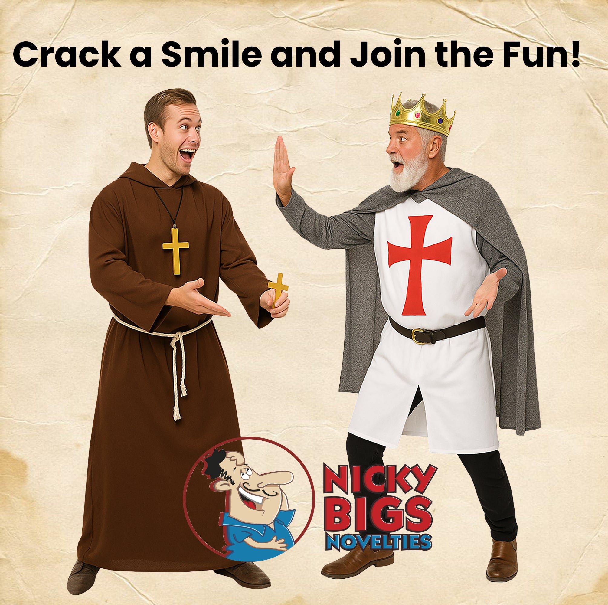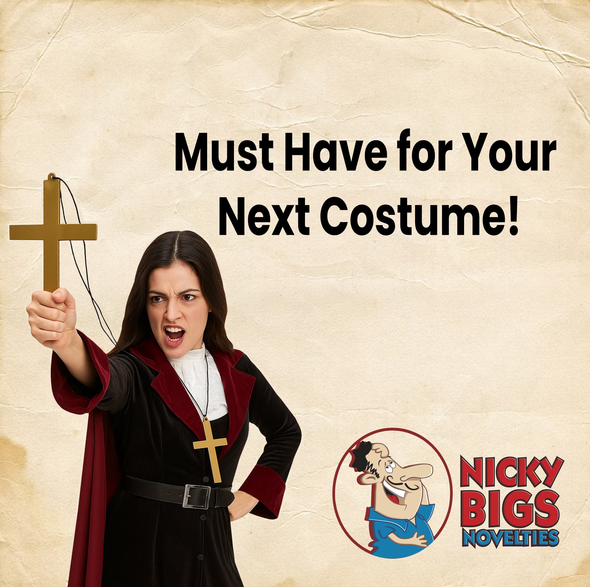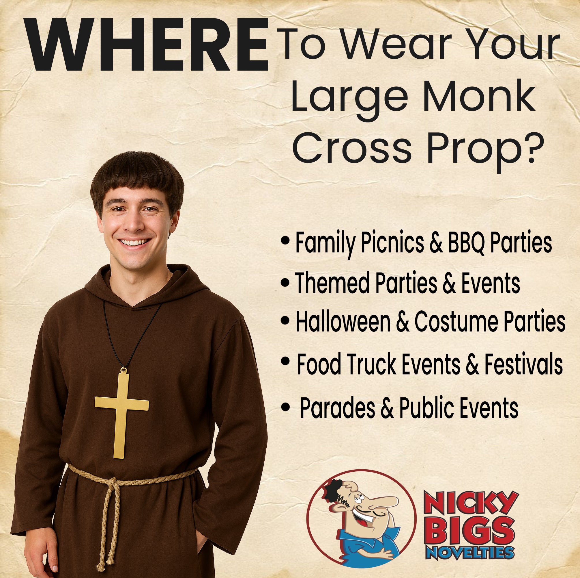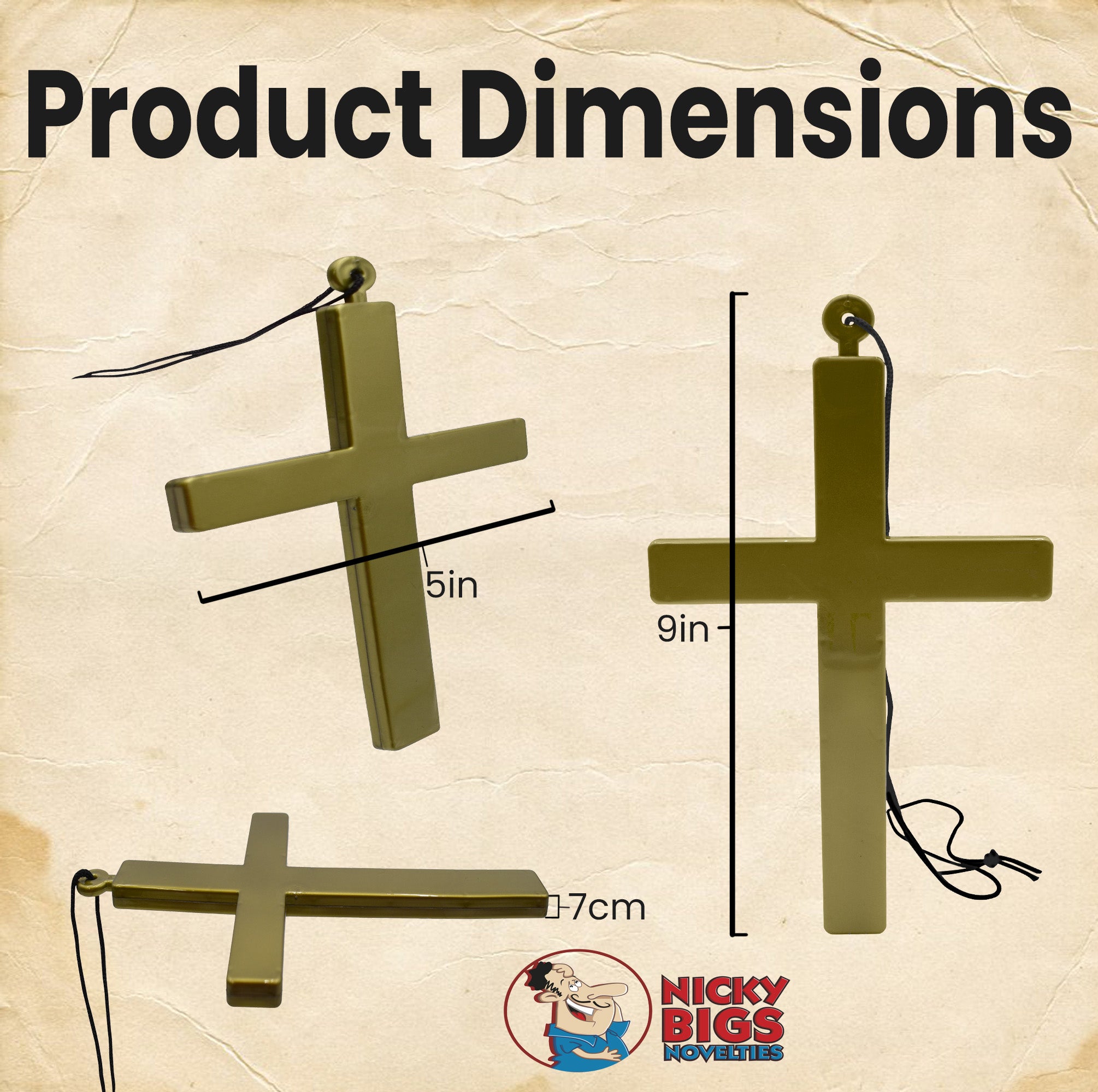 Take your Halloween costume or cosplay to the next level with this Gold Monk Cross Necklace Prop. Crafted from durable yet lightweight hollow plastic, this 9-inch tall and 5-inch wide cross is the perfect religious accessory for a variety of outfits. Whether you're dressing as a Pope, Priest, Nun, Monk, or other clergy character, this versatile prop completes your look with authenticity and flair. Designed with an attached string, it can be worn as a necklace or hung from a belt for multiple styling options. Ideal for Halloween costumes, theatrical performances, historical reenactments, church plays, and cosplay events. Suitable for adults and teens ages 14+. One size fits most.