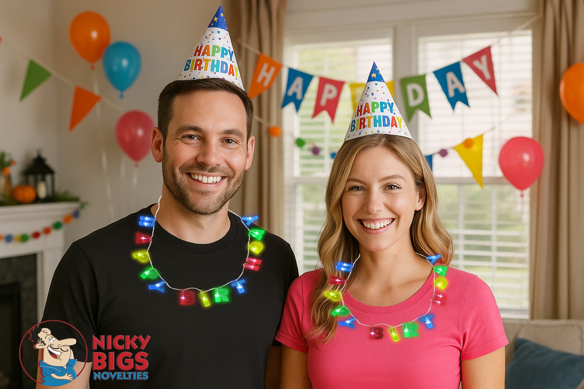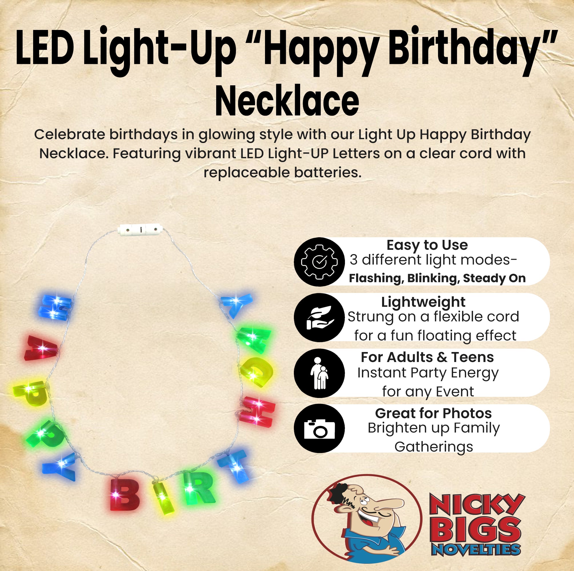 Celebrate birthdays in glowing style with the LED Lightâ€Up “Happy Birthday†Necklace from Nicky Bigs Novelties, powered by the heritage-rich, family-run Marsinos Costumes. Crafted in the USA with over a century of costume expertise, this festive accessory brings radiant fun to any celebration.