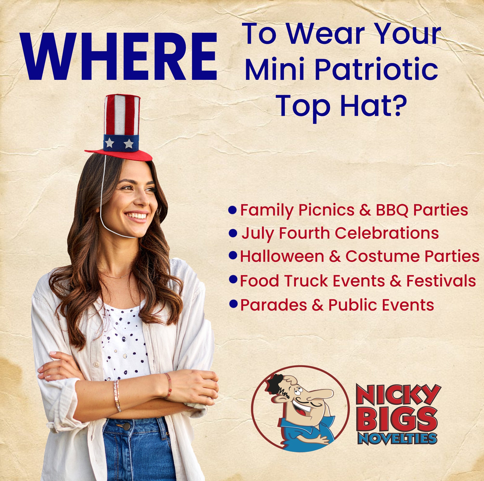 - Authentic Patriotic Design: Showcase your American pride with this mini top hat featuring classic red and white stripes, a deep blue band adorned with six white stars, and a tall, slender profile that captures the essence of Uncle Sam's iconic look.