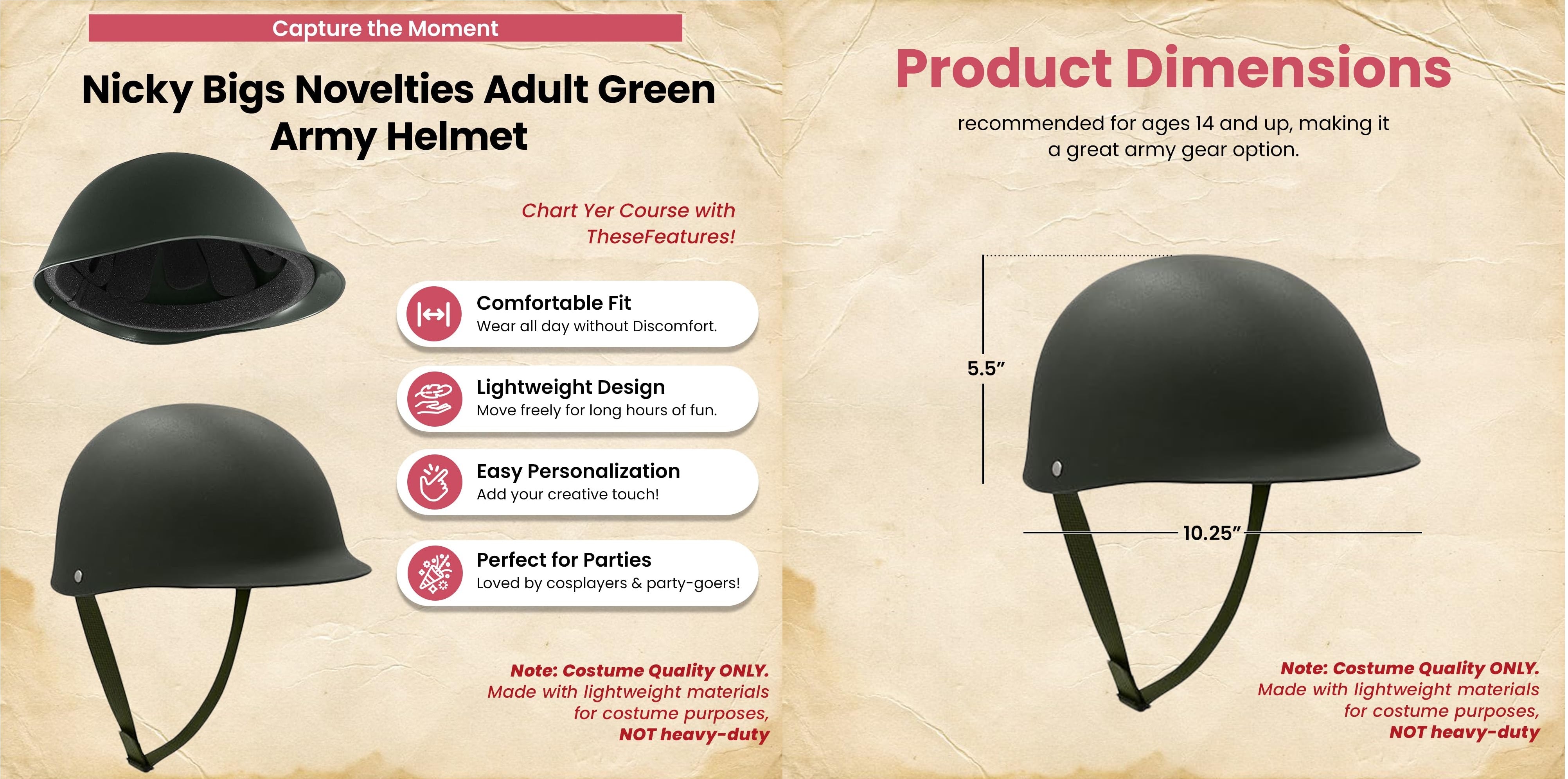 - LIGHTWEIGHT & COMFORTABLE DESIGN: Made from durable polypropylene plastic, this army helmet adult includes foam padding inside for a more comfortable fit. Whether youre dressing up as a military general costume accessory or need a plastic army helmet for a stage performance, it allows for extended wear without discomfort.
