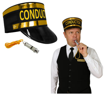 - Includes stretchable Conductor style hat with Silver whistle on attached lanyard
