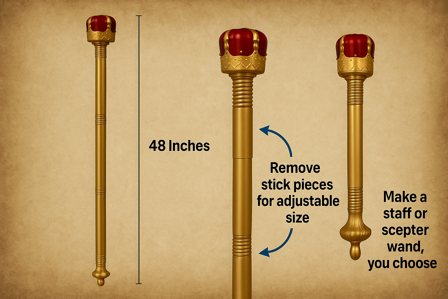 • Adjustable Length for Versatile Use: This regal scepter stands at an impressive 48 inches and can be easily adjusted by removing one or two inner staff sticks, allowing for customization to suit various occasions and preferences.