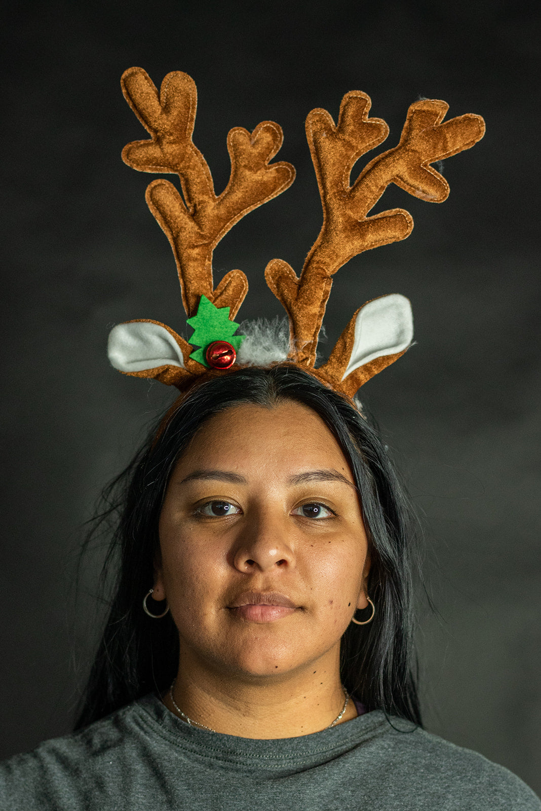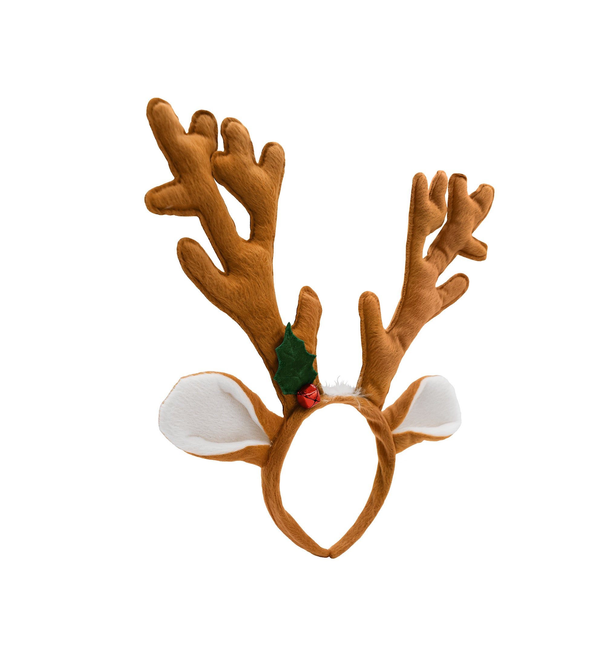 - This adorable head band features brown deer antler atop a headband with soft ears and a jingle holly berry accent.