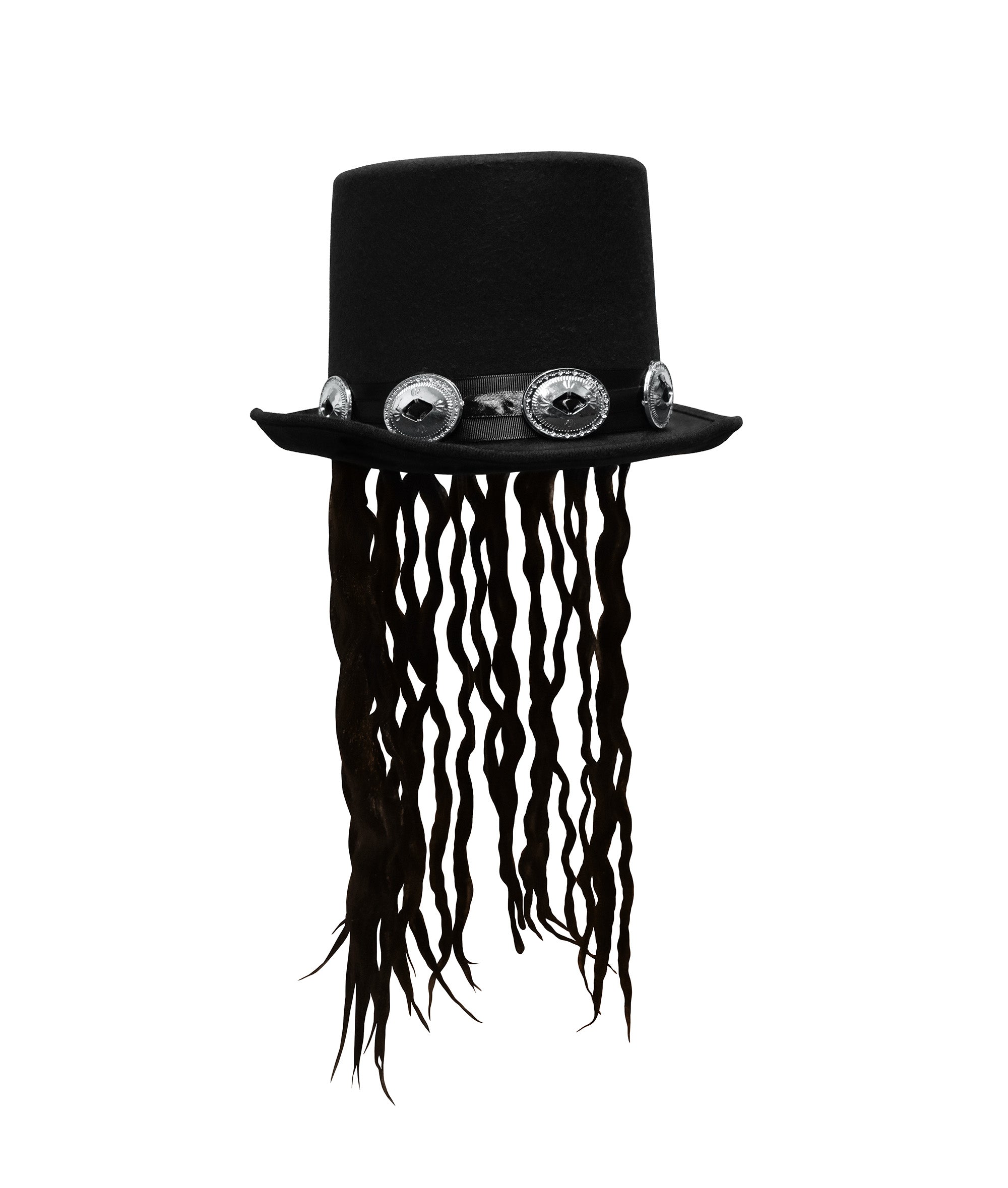 - Featuring a black top hat with a silver buckle band, attached twisted hair, and a sweatband.