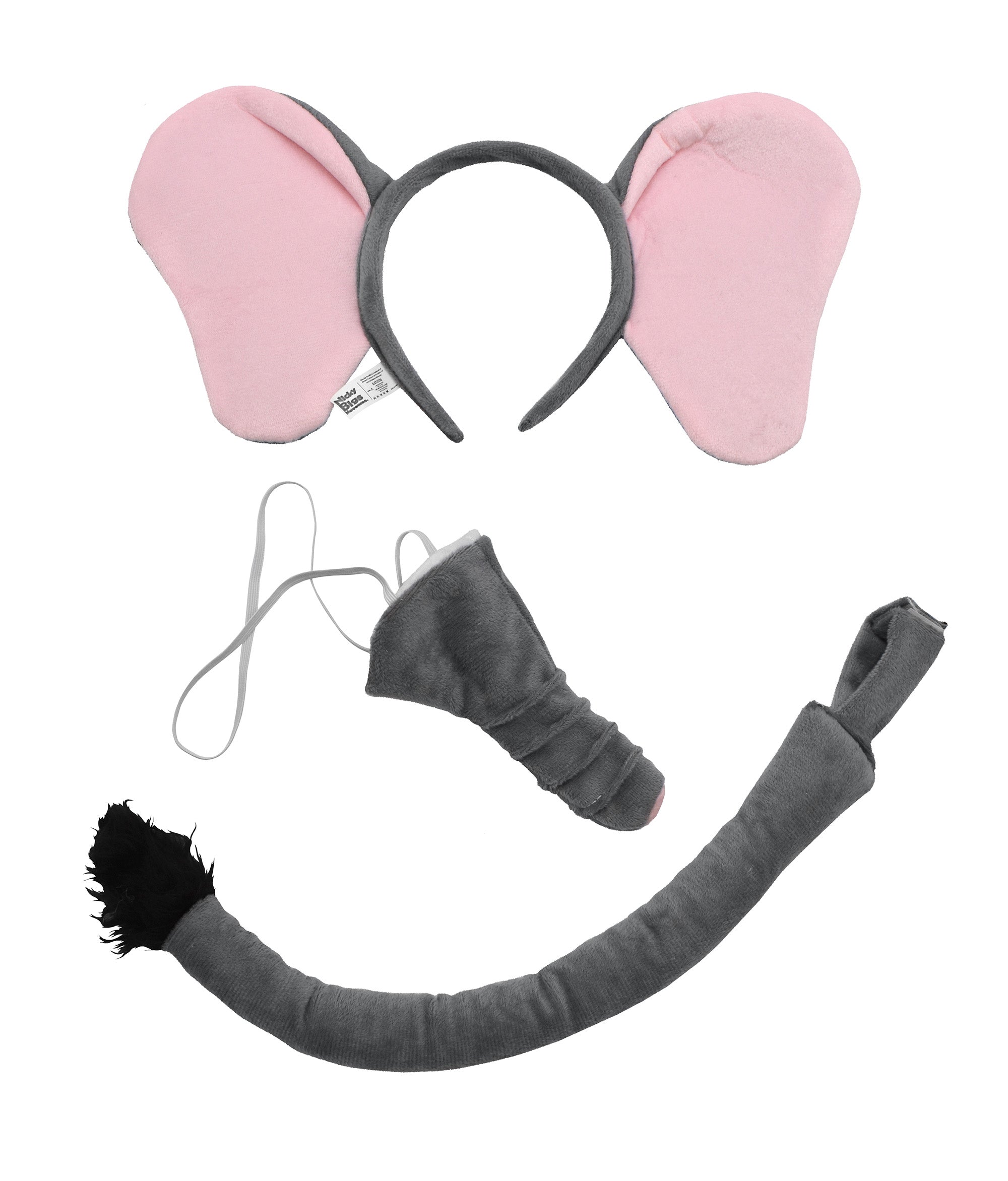 • Adult Gray Elephant Costume Accessory Set. Each set includes a headband with elephant ears, a matching nose and tail.