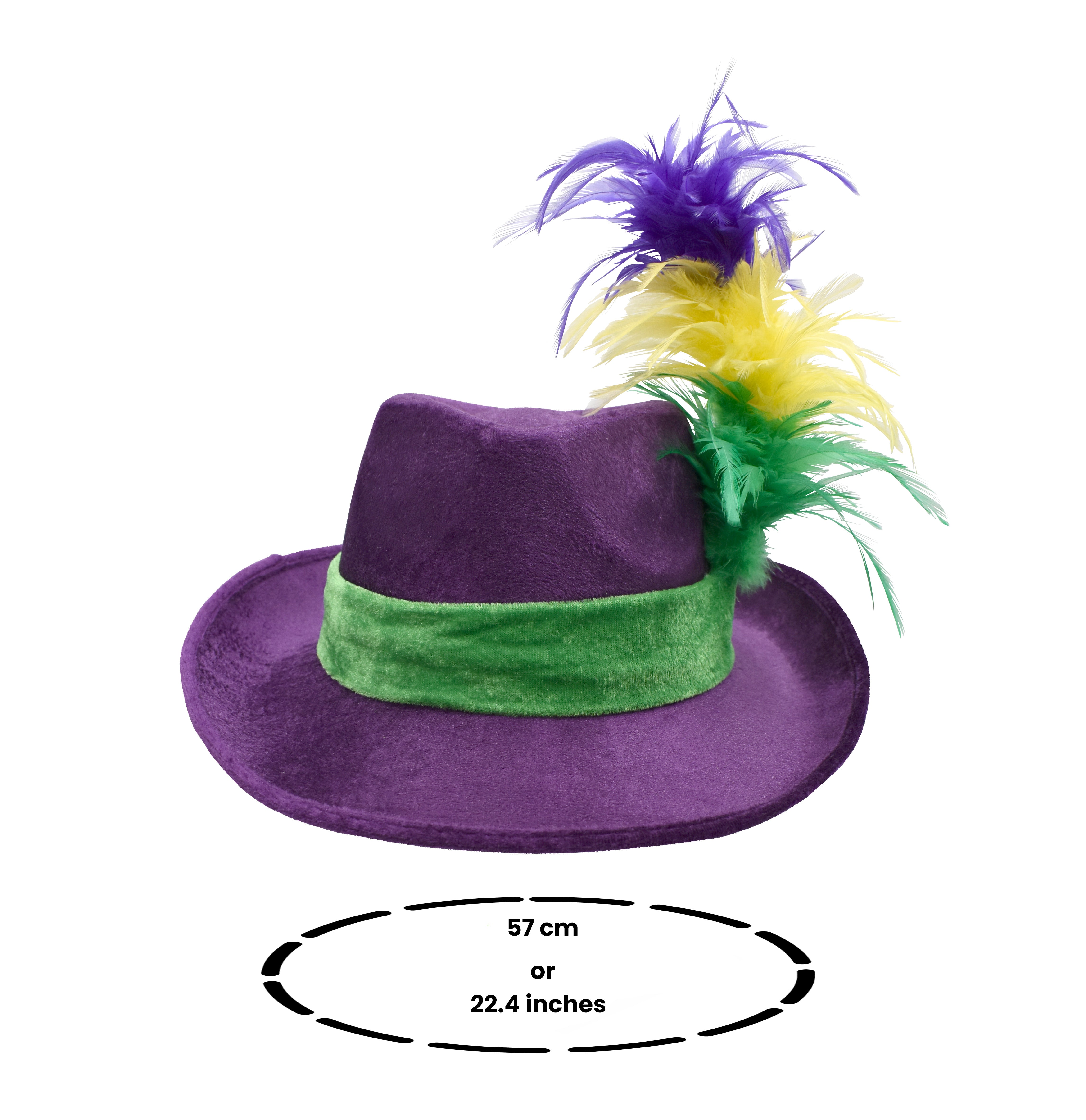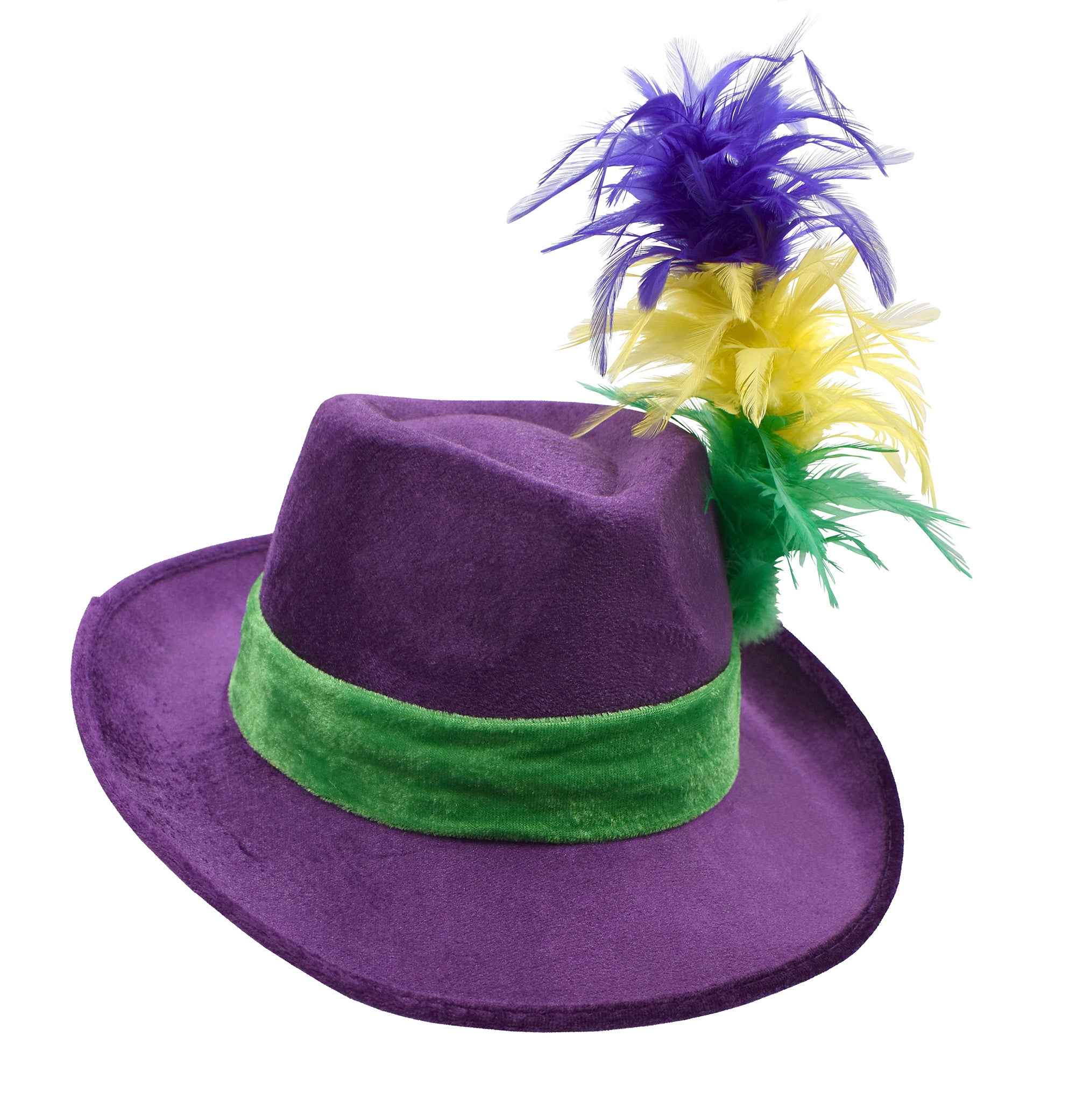 - Purple Mardi Gras Fedora Hat. Each festive hat features a fake feather plume with purple, yellow, and green feathers, and a green band.