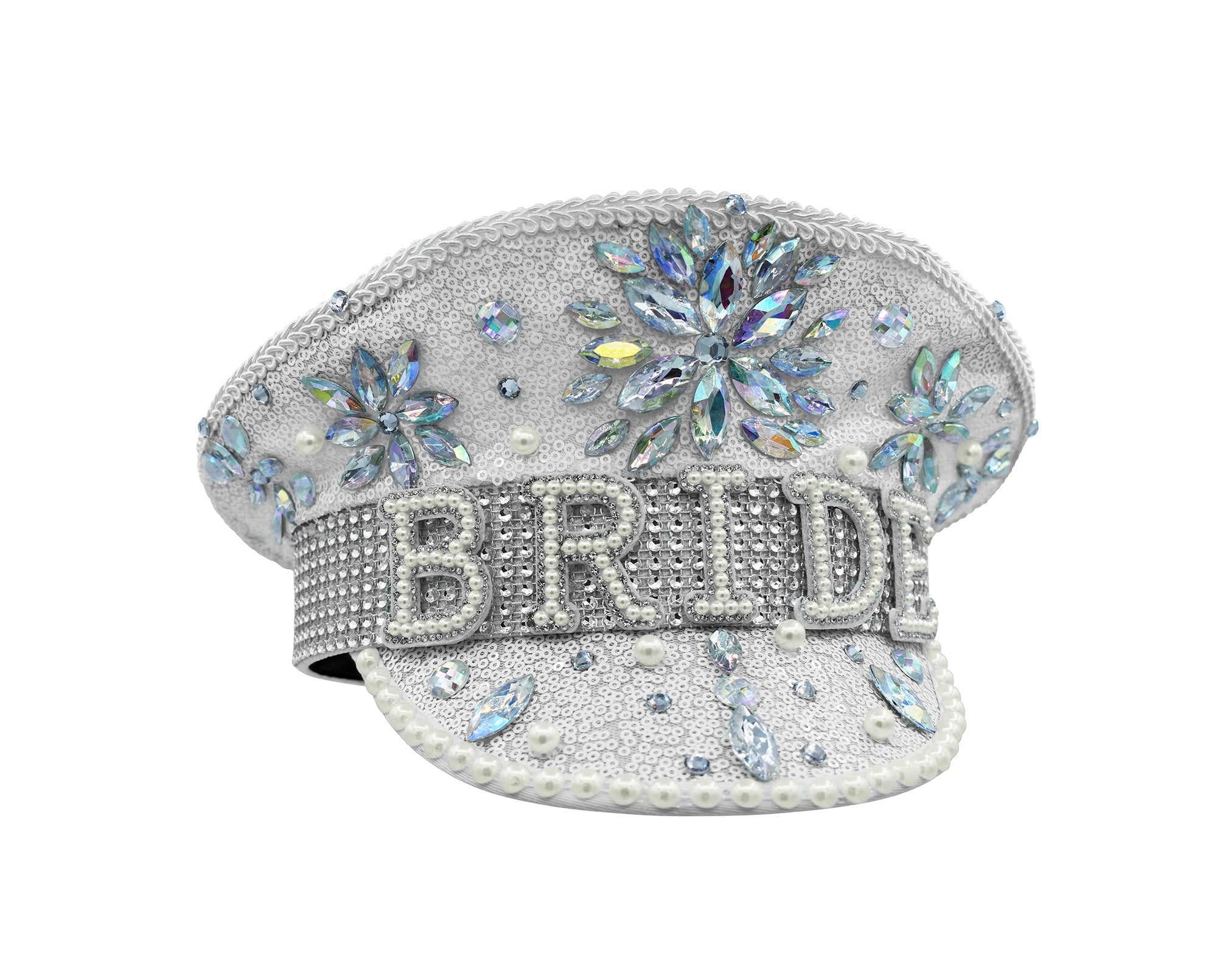 - Hat Features white sequins with iridescent gems in flower bursts, faux pearls accented with the word BRIDE and brim, with silver rhinestones.