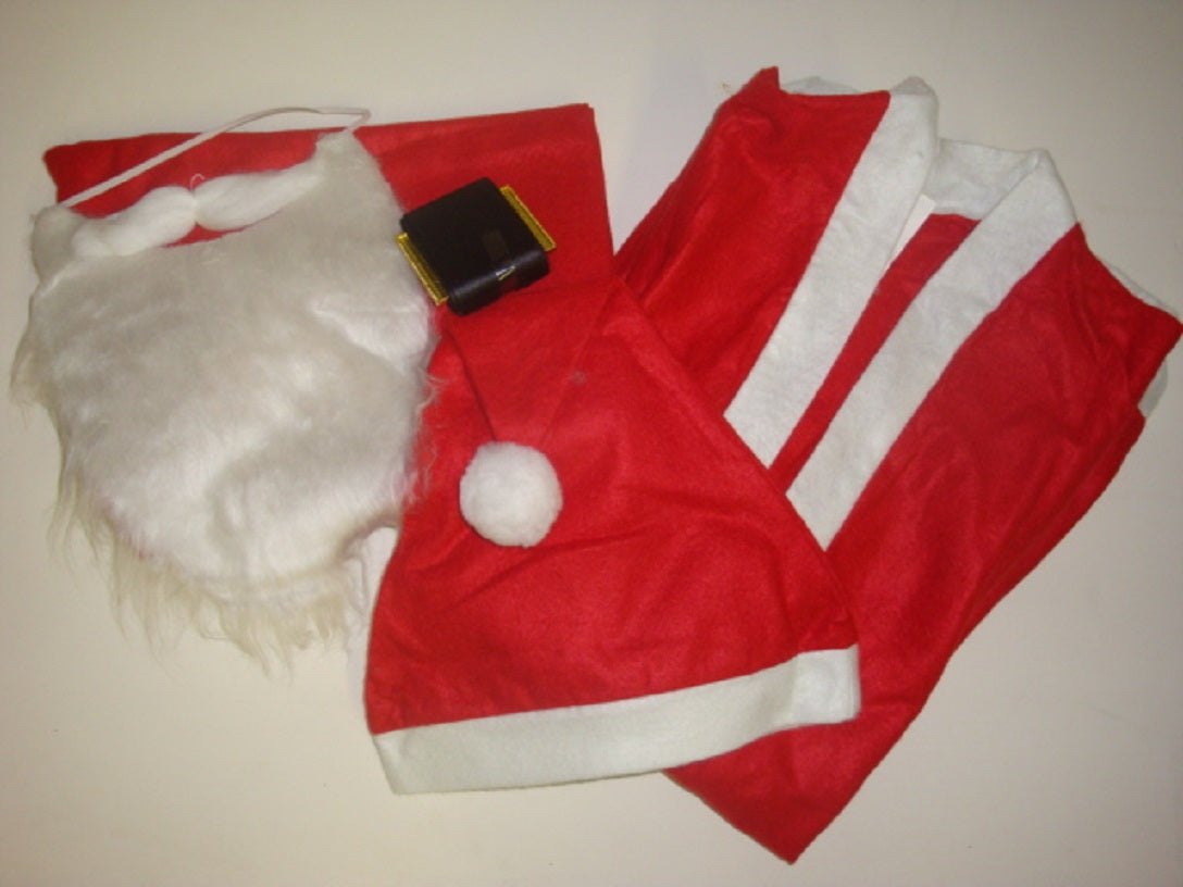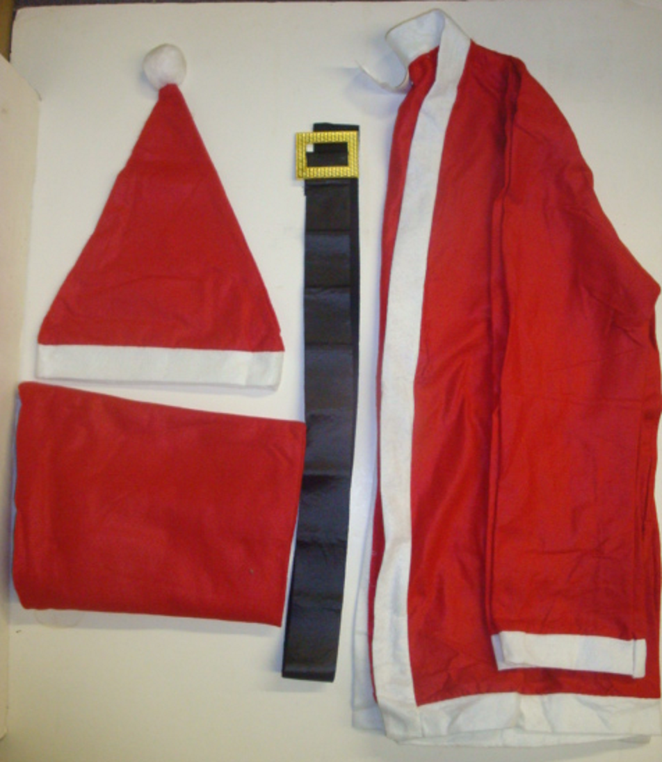 • Each set includes a jacket(coat), pants, hat, white beard, and a black belt. Made of red and white polyester felt that is THIN.