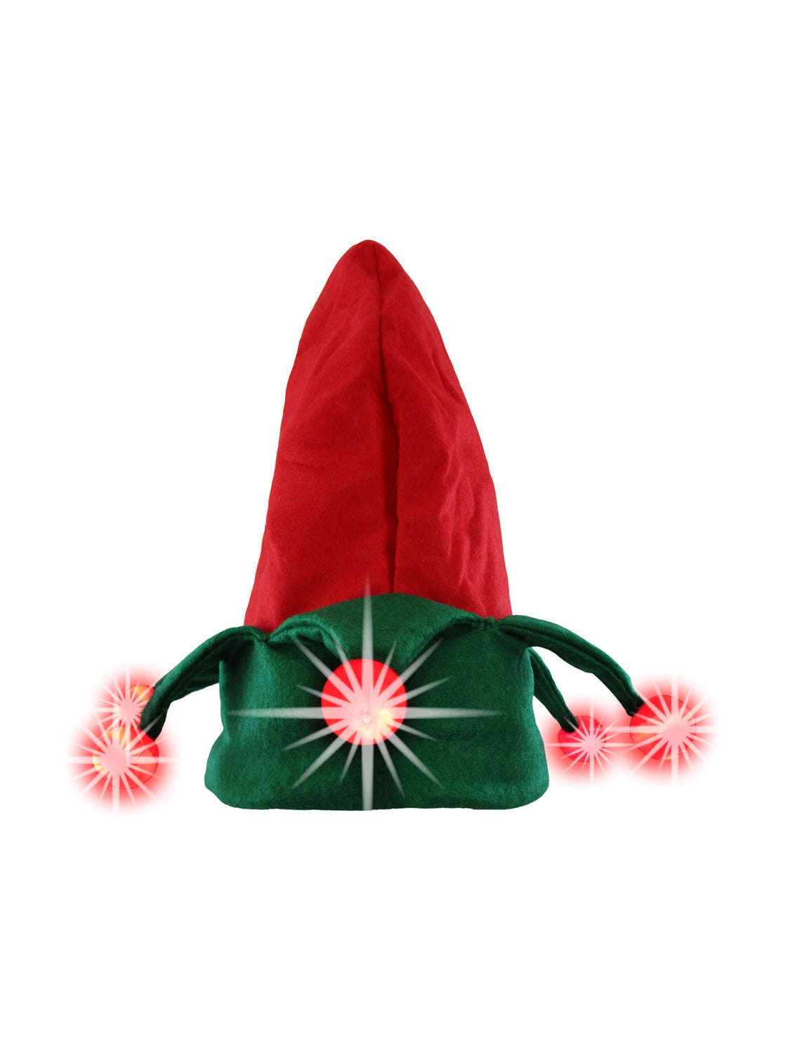 Bring whimsical cheer to your holiday festivities with the Nicky Bigs Novelties Light Up Elf Hat. Designed for adults and party-goers ages 14 and up, this red and green felt hat features flashing red LED pom poms that add a brilliant sparkle to any Christmas gathering, parade, or festive bar crawl. With five points topped with glowing balls and a curved, classic elf-style tip, this hat makes your look both jolly and unforgettable.