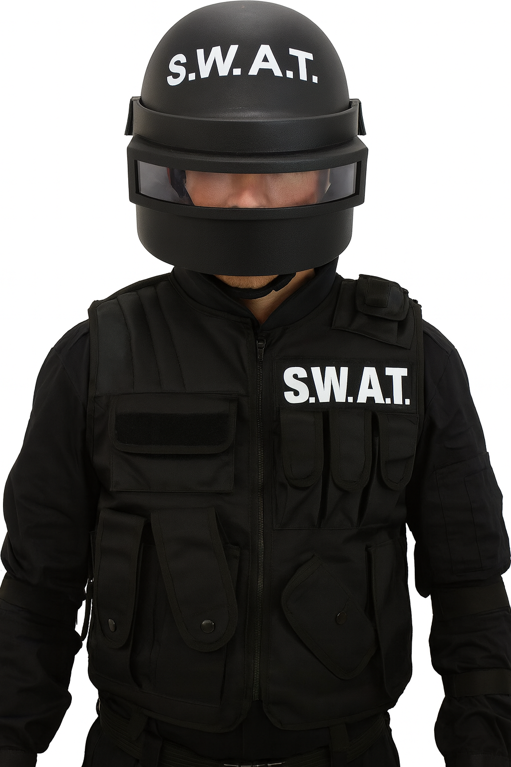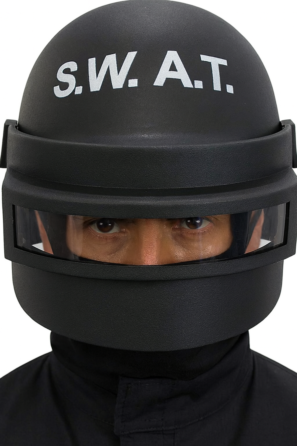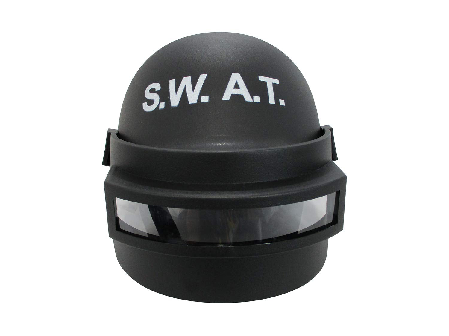 Step into character with the Nicky Bigs Novelties Adult S.W.A.T. Team Costume Helmet, a striking accessory that blends immersive design with practical comfort. This sleek black helmet features a bold “S.W.A.T.†print and an adjustable clear visor mounted on side hinges—simulating real tactical headgear in a lightweight costume form. Made from durable polypropylene plastic and lined with a full foam pad, it fits most adult head sizes up to 61â€cm (24â€in), secured by a chin strap for stability during movement.