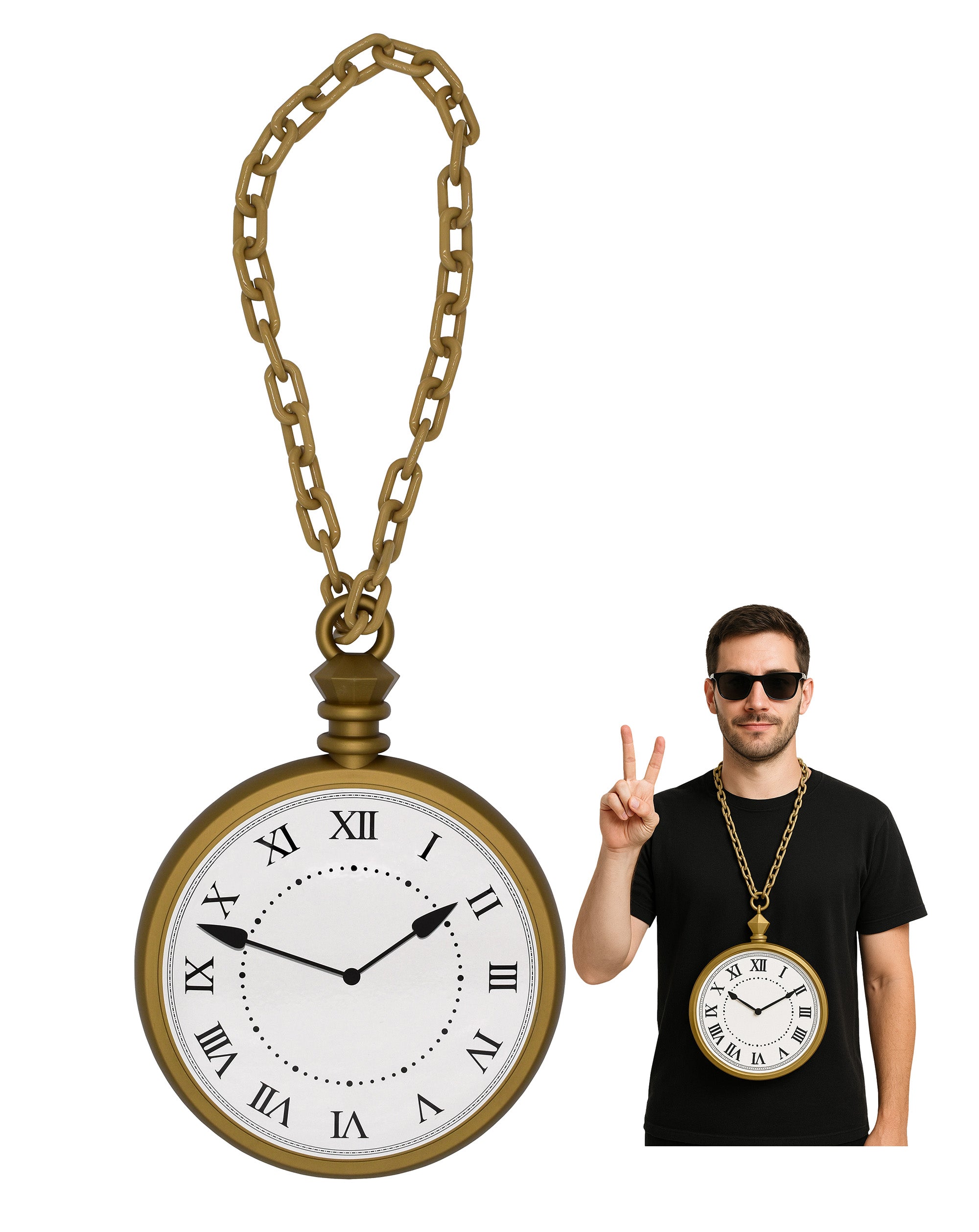 The attention-grabbing clock necklace comes with a 16-inch faux-gold chain and a Roman-numeral clock face measuring approximately 10 by 14 inches. It calls back to swaggering âTime Is Moneyâ eras, adding comedic flash to your costume while remaining wearable for photos, performances, or simply getting a laugh.