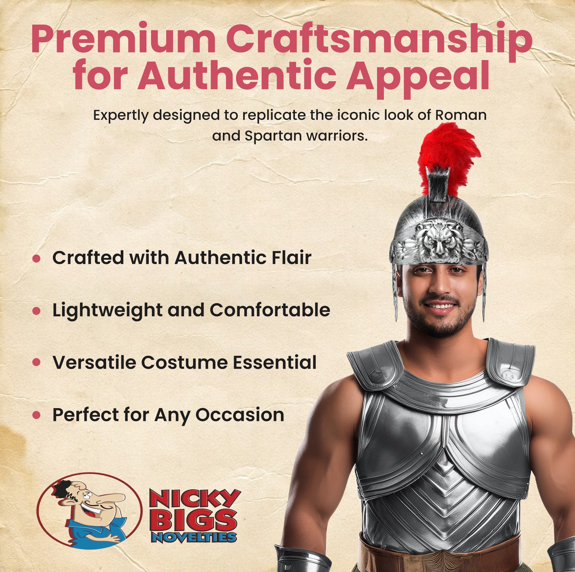 - STRIKING RED FEATHER PLUME: Stand out with a bold, detachable red feather plume on silver helmet that adds authenticity to roman gladiator costume men and a dramatic touch to your costume. This gladiator costume helmet includes movable chin and ear guards for added realism and comfort.