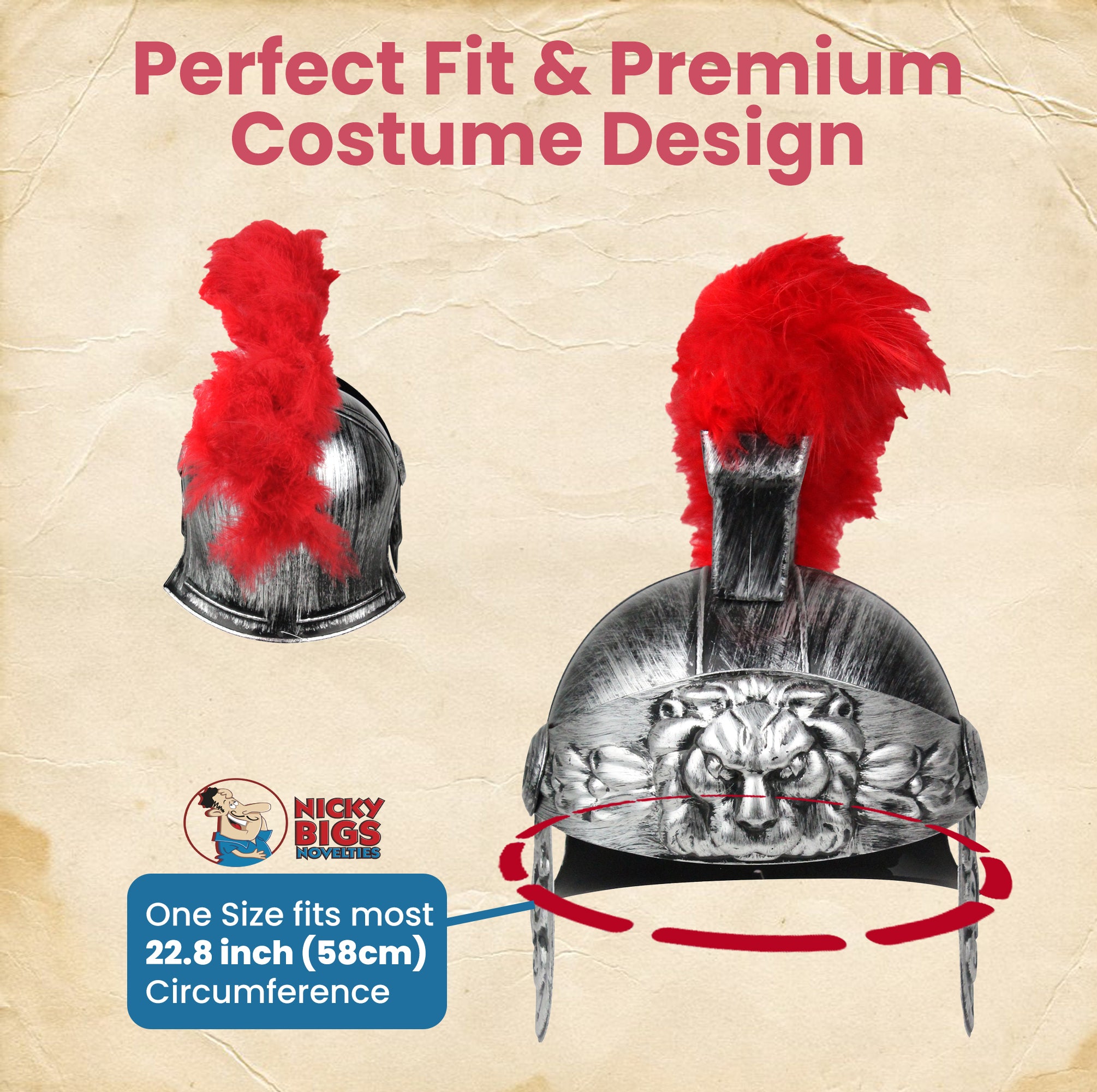 - COMFORTABLE ADULT FIT: Sized at 58cm or 22.8 inches in circumference or 7-1/4 hat size medium/large. Designed to fit most adults and teens aged 14 and up, this roman warrior costume men helmet offers a snug, comfortable fit thats ideal for extended wear at events and parties. Lightweight and secure gladiator accessories costume, it allows for a worry-free costume experience. Please note, this is a roman soldiers costume accessory and not a protective device.