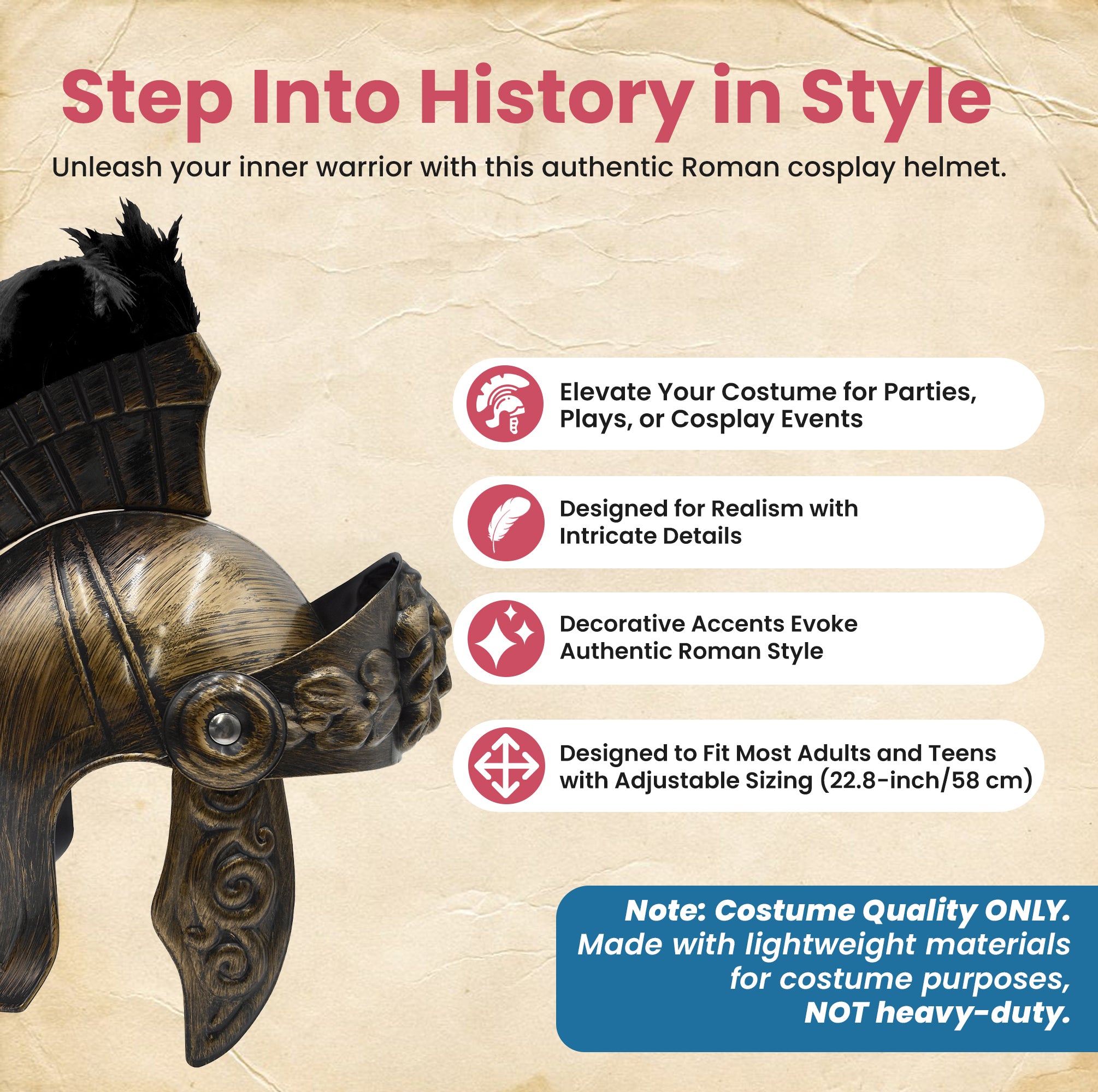 - AUTHENTIC ROMAN DESIGN: Step into character with this realistic Roman adult soldier costume helmet, crafted from durable plastic to resemble knights helmet ancient legionnaire armor. Perfect for completing any gladiator, centurion, or Roman Empire costume with a true-to-history look.