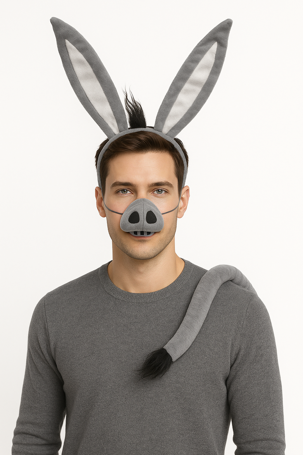 Bring farmyard fun to life with this complete Gray Donkey Costume Accessory Set for adults. Featuring bendable jumbo ears attached to a plush headband, a soft fabric nose with cartoon-like charm, and a poseable tail with easy loop attachment, this set covers every detail to turn your outfit into a lovable donkey ensemble. Designed for comfort and creativity, it’s perfect for Halloween, animal cosplay, themed school events, and pretend play. The oversized ears and tail add animated flair, while the easy-wear design ensures you can focus on fun. Whether you’re in a skit, snapping pics, or simply horsing around, this costume set brings your character to life.