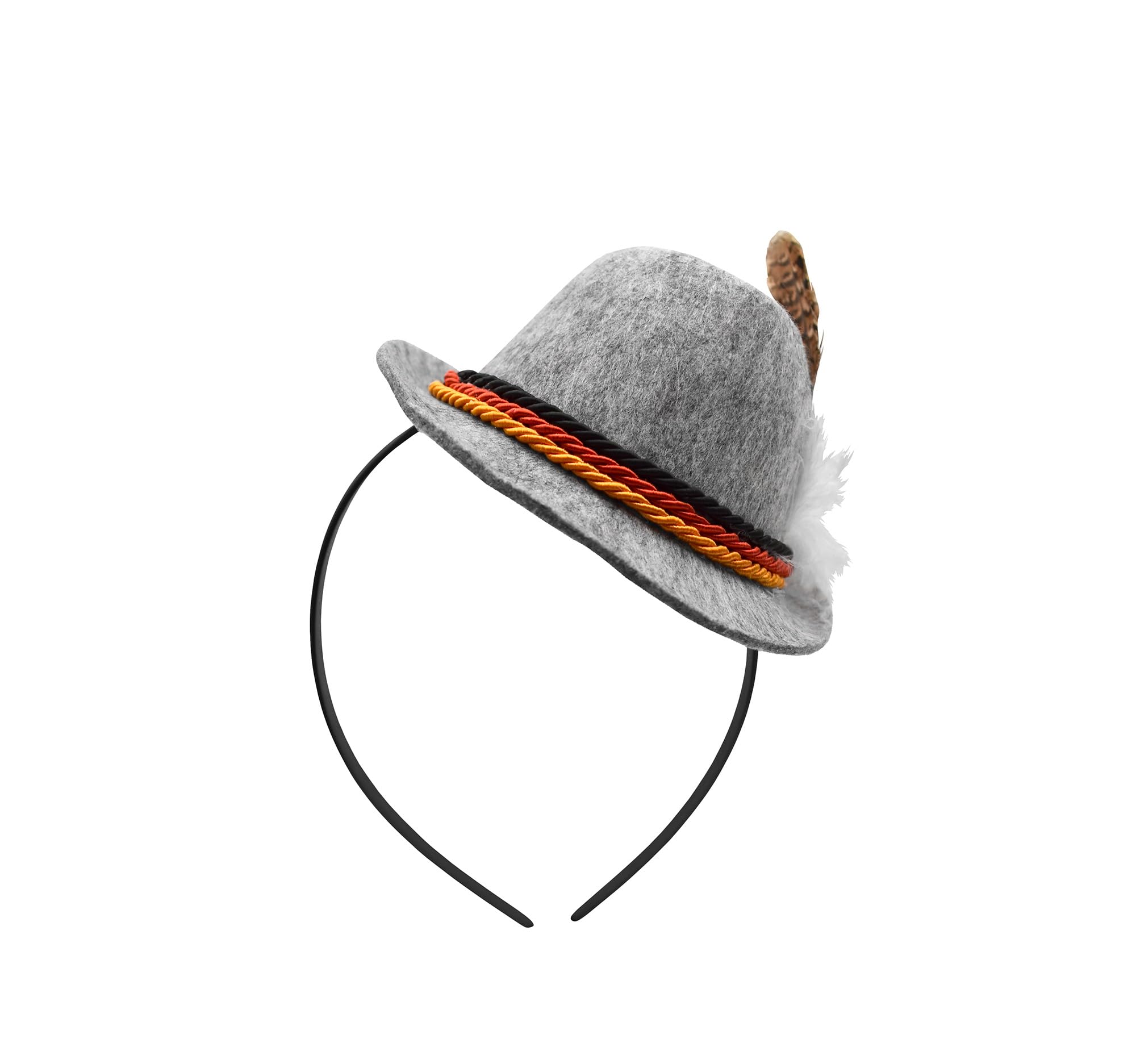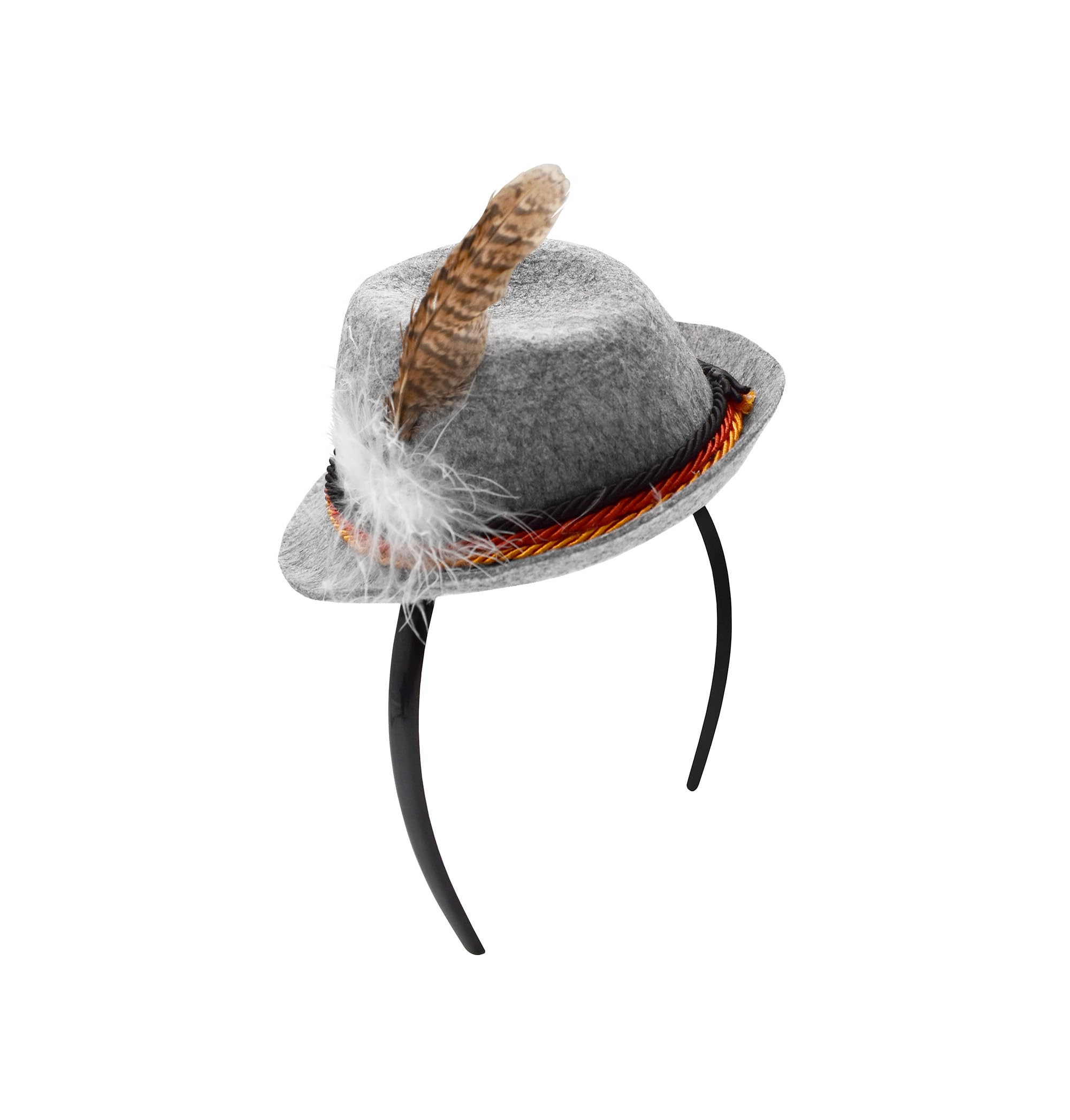 - Mini Alpine Hat with Feather Trim: This deluxe mini fedora hat is made from lightweight pressed felt for a soft yet structured feel. Measuring about 2 inches tall and 5.5 inches long, it features a braided rope band and colorful feather accent, all attached to a flexible headband. Comfortable enough for all-day wear, it adds the perfect Bavarian touch to your festival outfit.