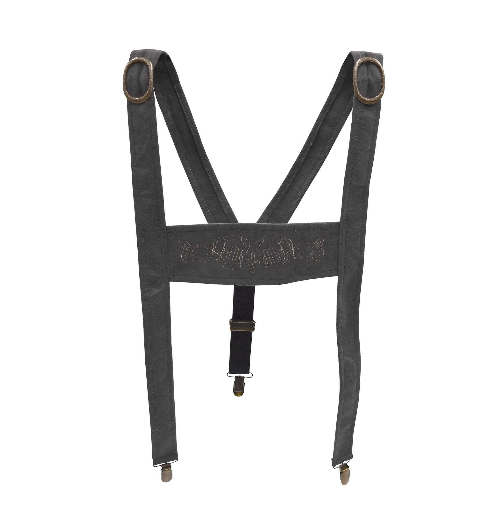 - Decorative Gray Suspenders: The included lederhosen suspenders feature a decorative front panel embroidered with two beer mugs and traditional alpine motifs. While primarily designed for visual appeal and costume authenticity, they’re equipped with functional clips for easy attachment. At full length, suspenders measure approximately 25 inches.