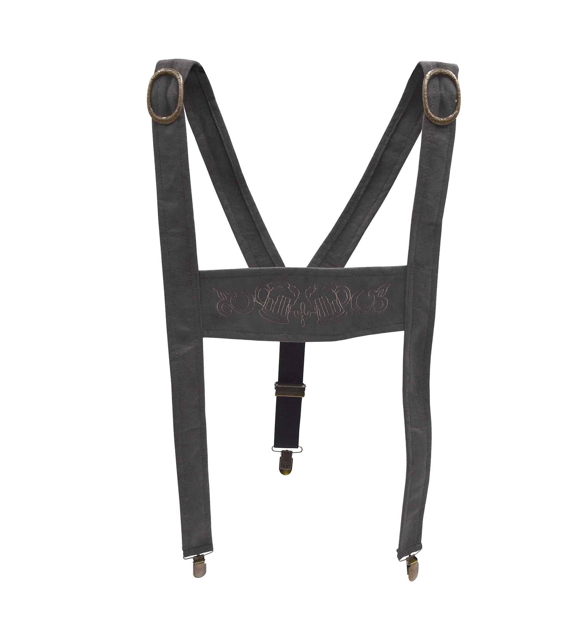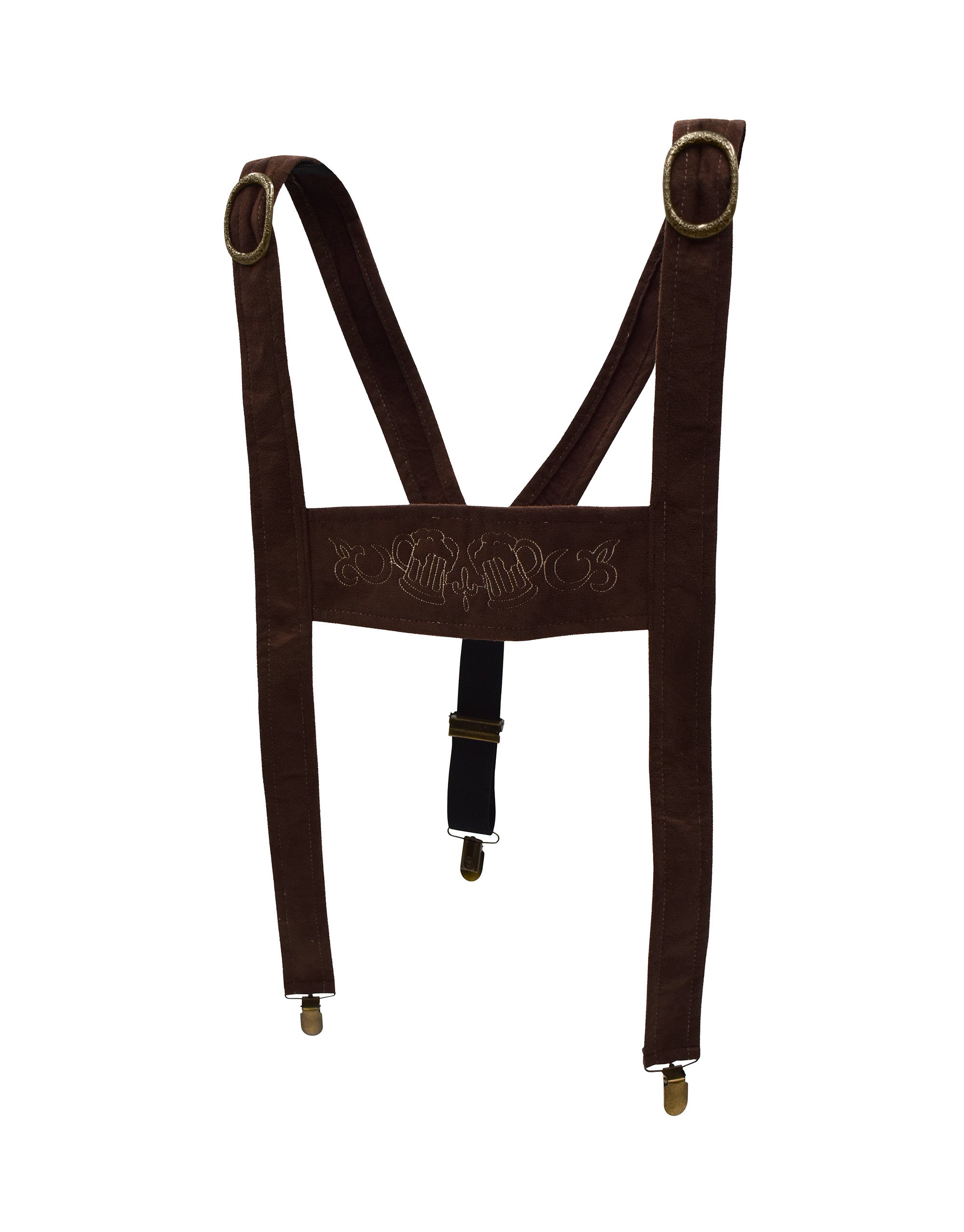 - Embroidered lederhosen suspenders with a playful beer mug motif. These adjust from 21 to 25 inches, ensuring a snug and customized fit.