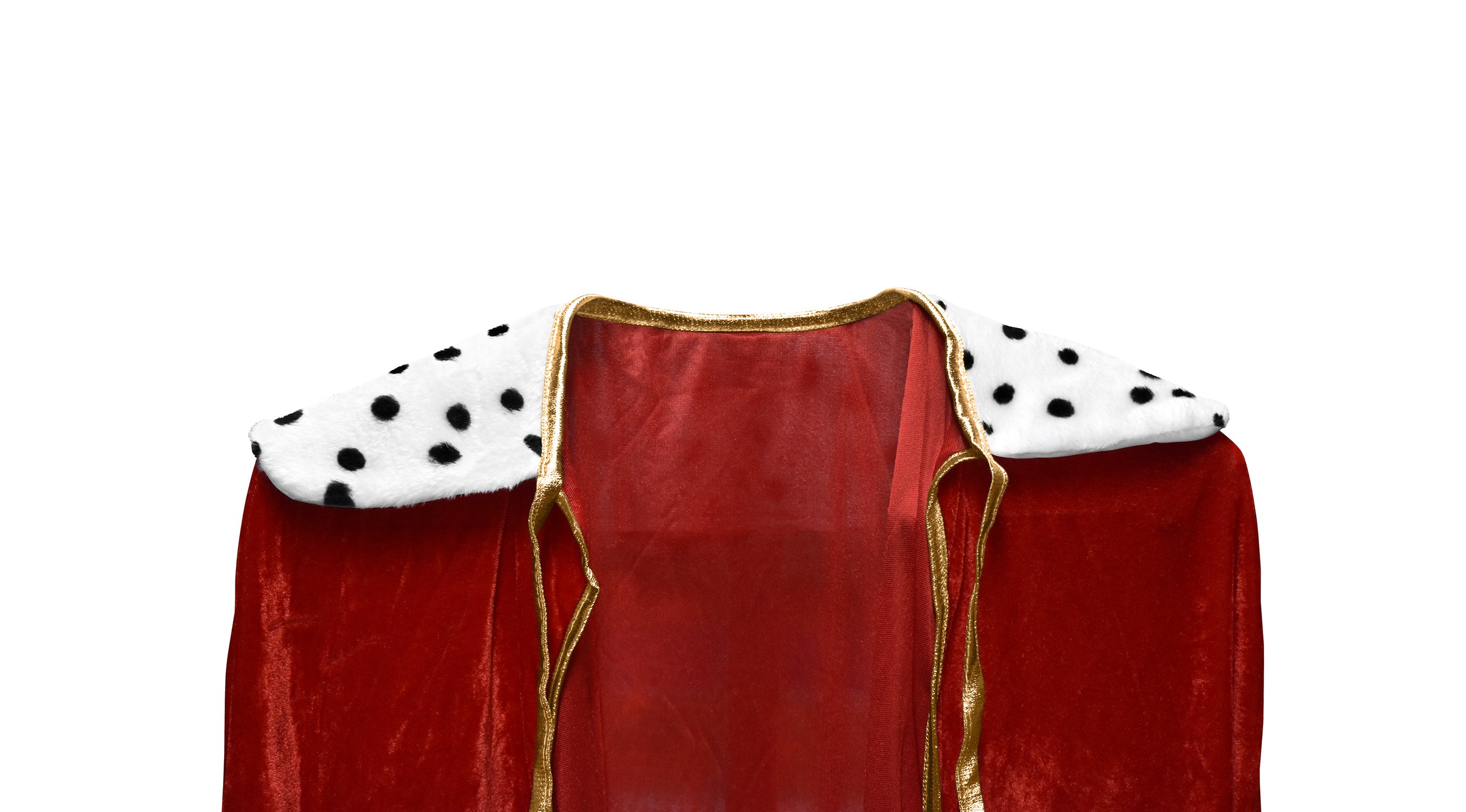 - Unisex Adult King or Queen Robe featuring a white spotted faux fur collar and a matching Gold Crown accented with faux gems. Choose from Red/Gold or Purple/Gold.
