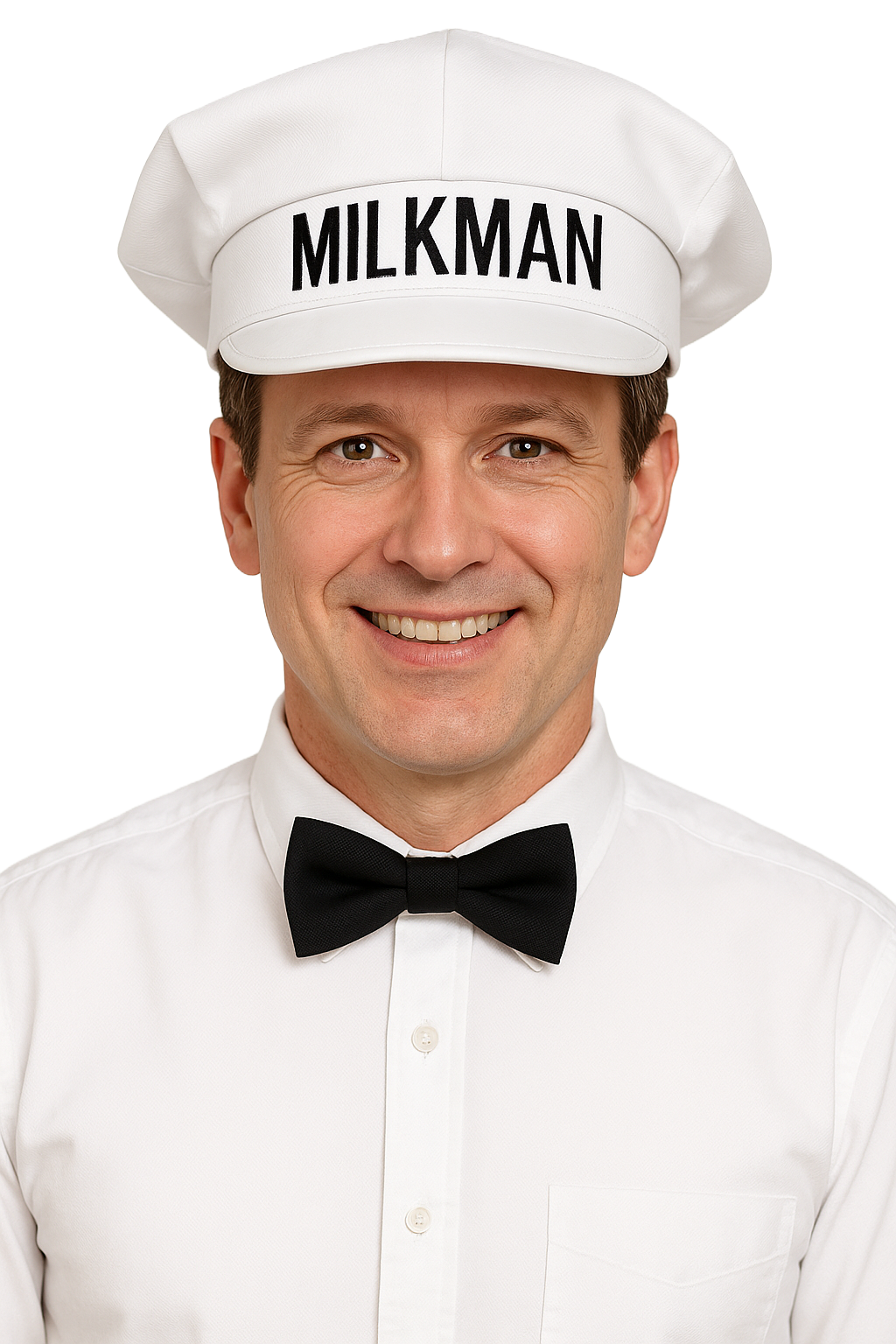- Novelty White Milkman Hat and Black Bow tie Set. Milk Hat fits from 54 cm to 62 cm or 21.25 inches to 24. 4 inches.