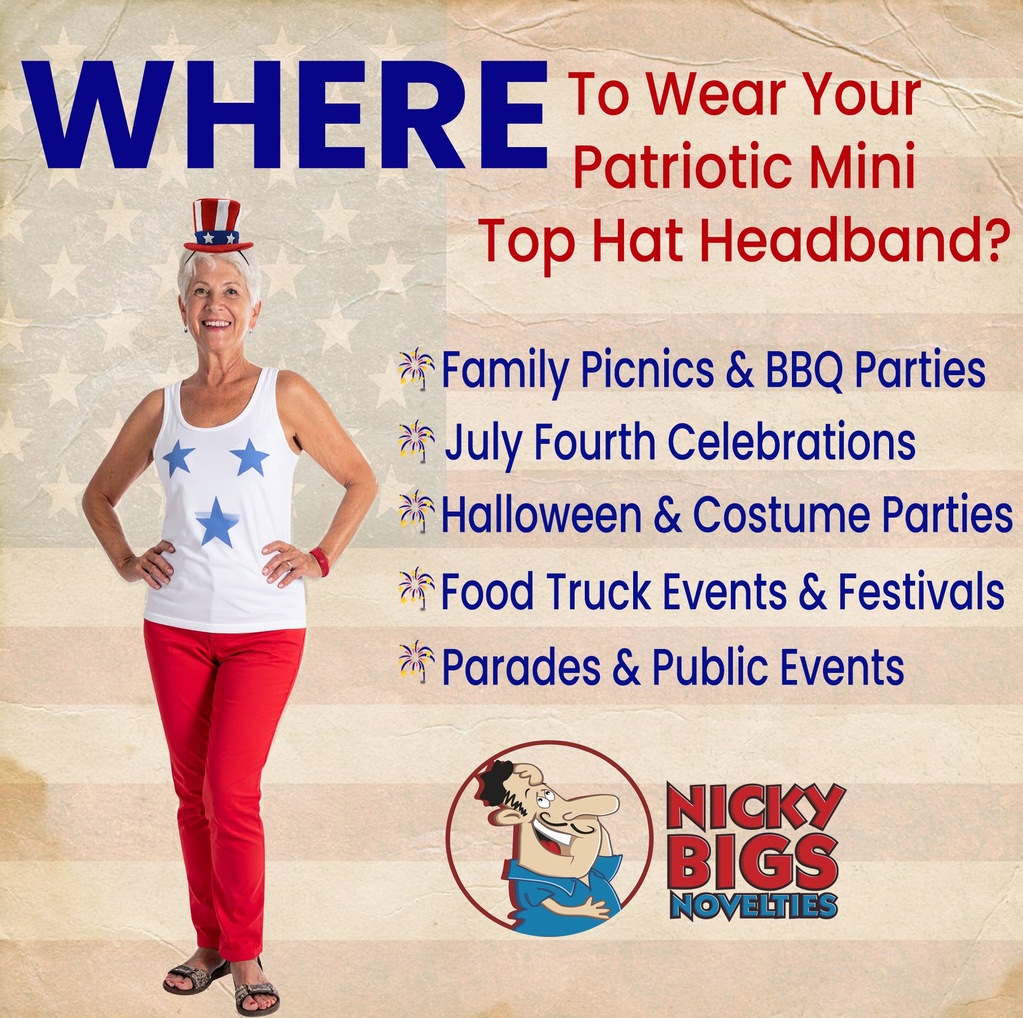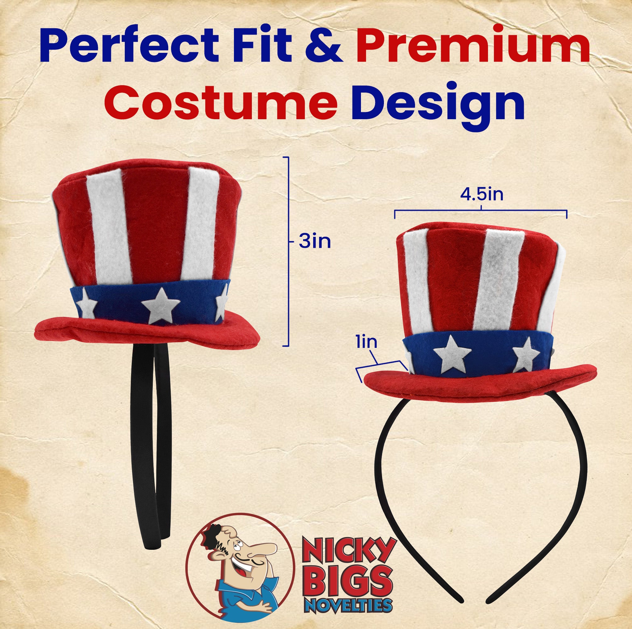 Show your stars and stripes in style with the Nicky Bigs Novelties Patriotic Mini Top Hat Headband. This playful accessory features a soft red felt mini top hat accented with crisp white stripes, a bold blue band, and iconic white stars—channeling the classic Uncle Sam look in a compact, wearable form. At approximately 3 inches tall and 4.5 inches wide with a 1-inch brim, it makes a cheerful yet subtle statement that's perfect for celebrating America in any setting. Attached to a flexible and lightweight headband, this piece fits comfortably on most heads and stays put whether you’re parading, grilling, or posing for photos. Designed for both teens and adults, it's a fantastic addition to patriotic costumes, July 4th parties, themed events, and spirited school functions. Crafted with attention to detail and built for comfort, it delivers festive flair without the fuss. Just spot clean to keep it looking fresh year after year. Whether you’re planning a fun group costume or want to stand out solo, this headband is your go-to for effortless patriotic charm.