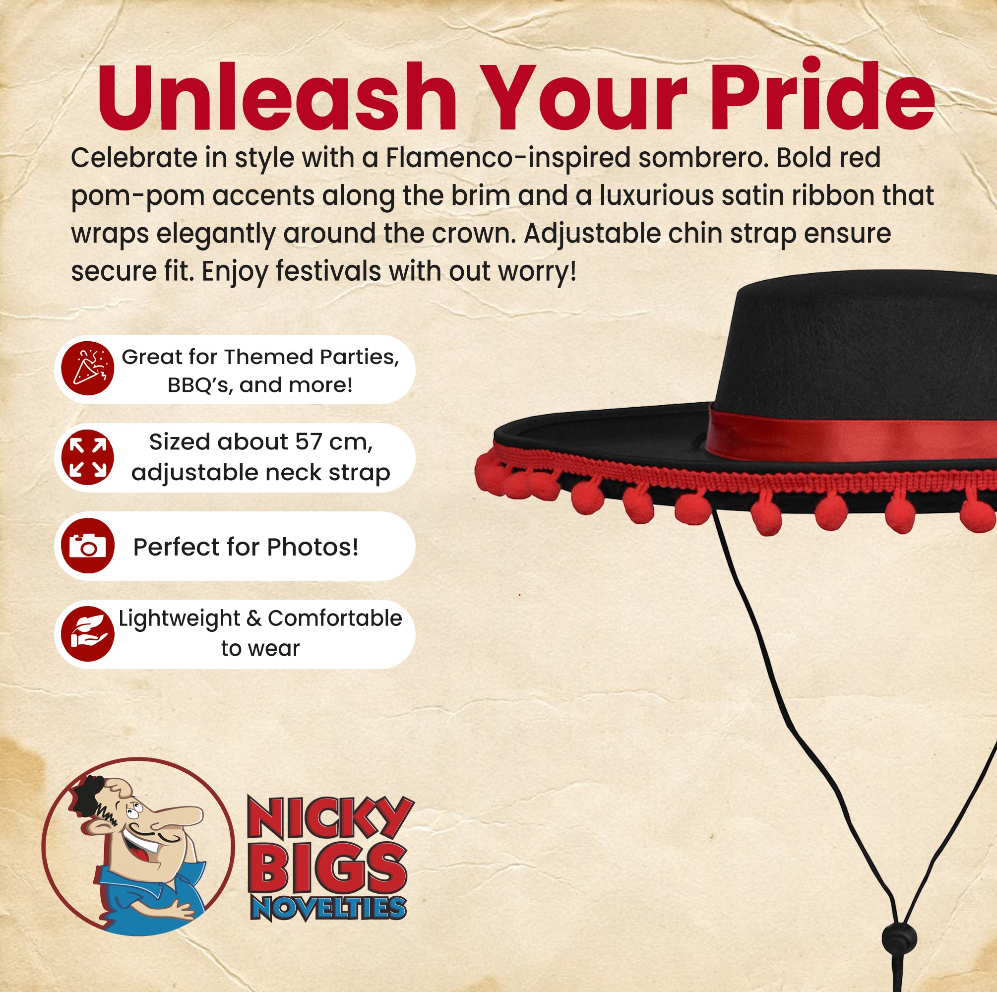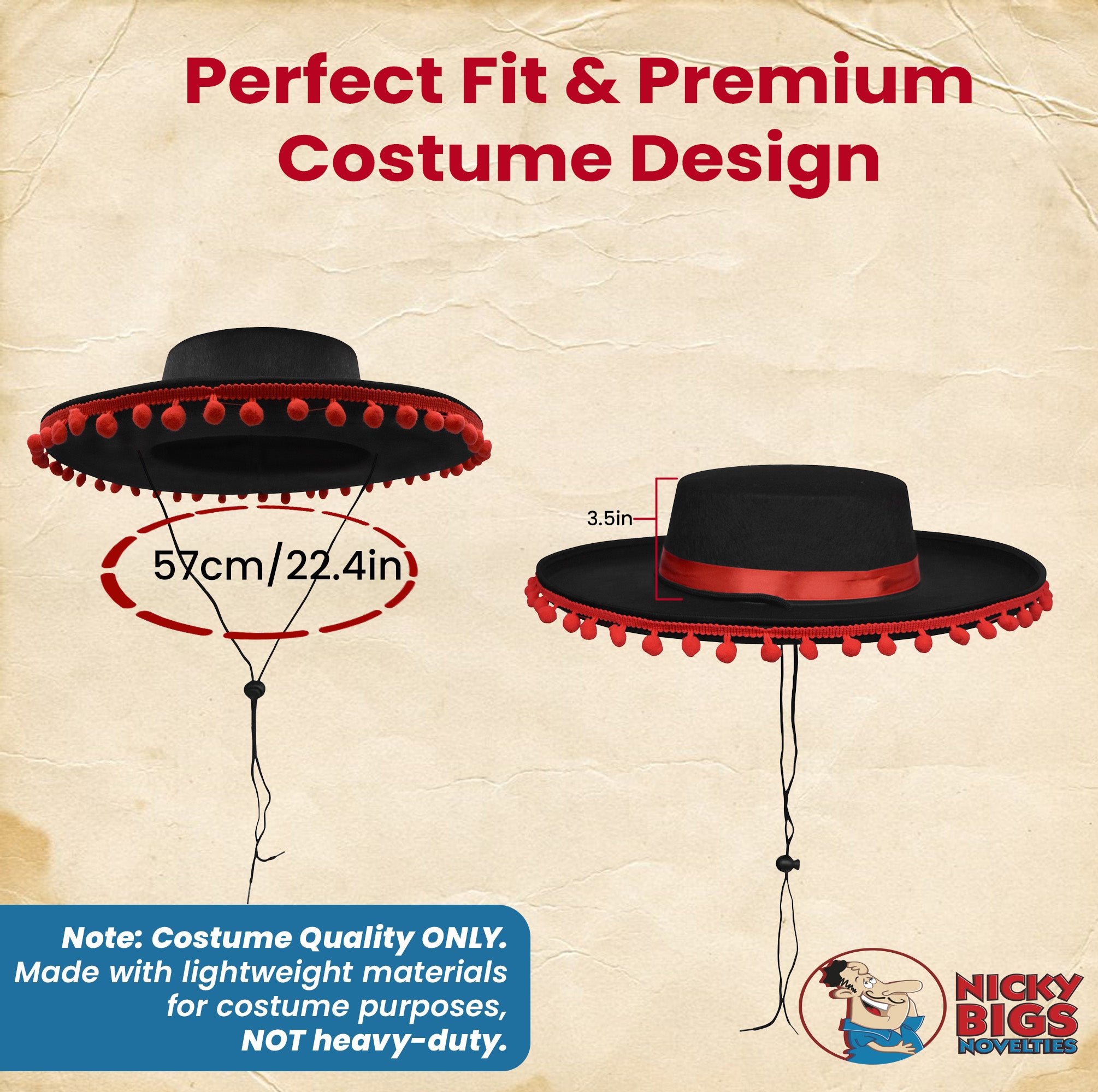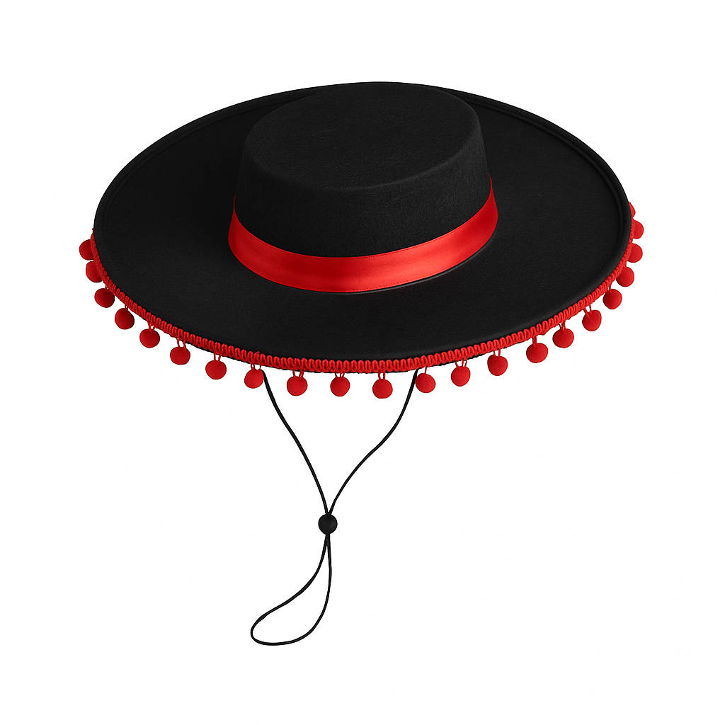 - Classic Matador Hat This black felt bullfighter sombrero features an adjustable neck string and eye-catching red pom-pom trim. Designed for Spanish and Mexican-themed costumes, fiestas, and performances, it brings flair to mariachi bands, flamenco dancers, and Day of the Dead celebrations.
