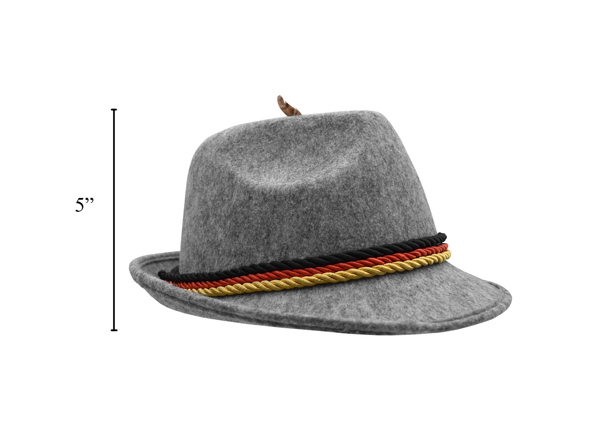 This holiday season complete your look with this Deluxe Adult Wool German Oktoberfest Alpine Fedora Costume Hat. Perfect for Men, Women, and Teens! Each elegant hat fake features a matching corded braids accenting the base with a beautiful grouping of faux feathers. This Swiss Alpine fedora is great for all Oktoberfest festivals! Choose from Gray, Green, or Brown. Each costume quality fedora style hat has a slight pinch top and fits approximately 56 cm or 21 inches in circumference. The hat is about 5 inches tall at the tallest point. The fedora measures about 11 inches long and 9.5 inches wide. Add a pair of Lederhosen Suspenders for a completed Oktoberfest Costume! Lederhosen suspenders are not included. Lightweight and comfortable to use, this hat is perfect for any day! Great for Halloween, Cosplay, Theater, Everyday Wear, and more! For ages 14 and older. Spot clean only. Made of wool.