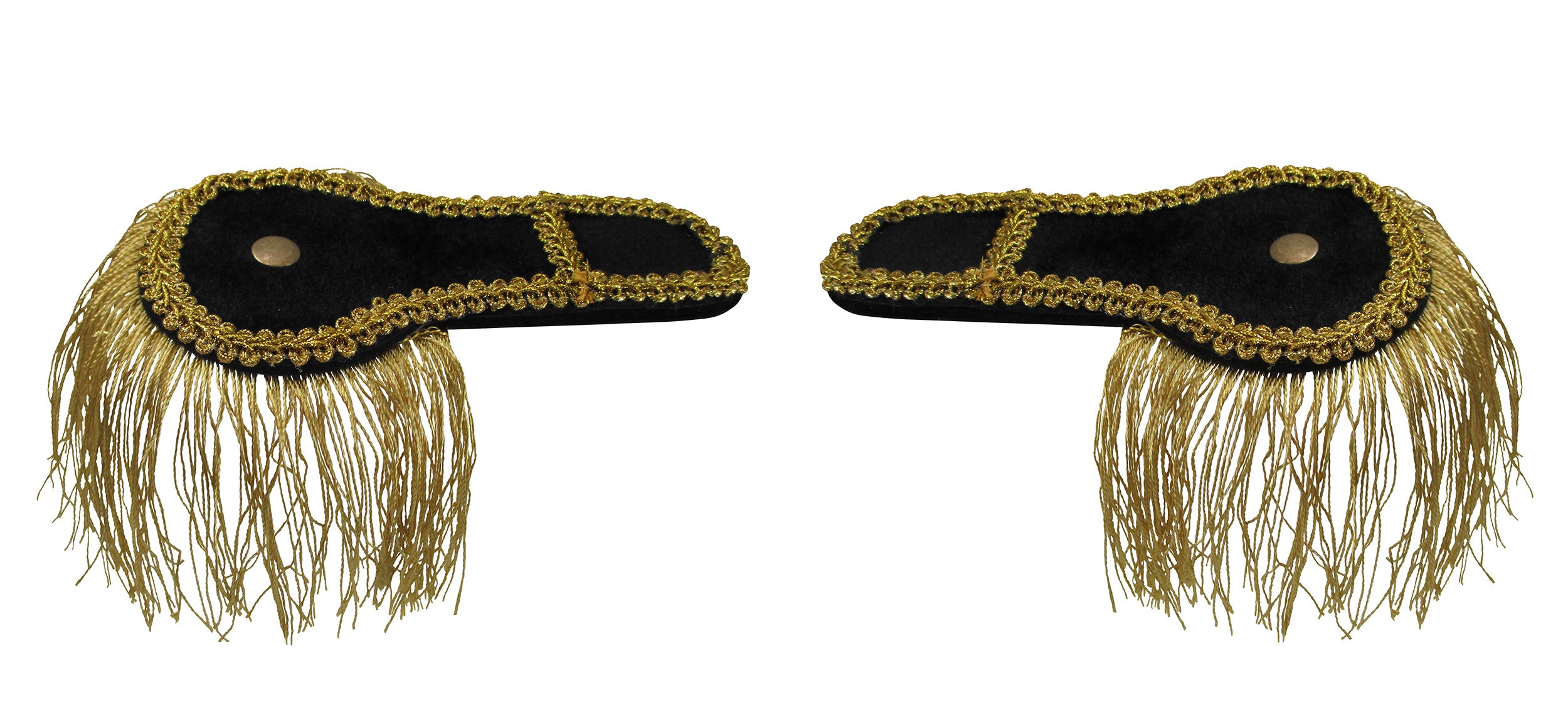 Each kit includes a Majorette-style hat complete with a structured bill, shiny gold buttons, and elegant gold trim, standing approximately 5" tall to add commanding presence to your look. The shoulder epaulets are approximately 6" long, featuring metallic gold fringe tassels (approx. 3") and a faux button. Each epaulet attaches securely using two integrated pins, making it easy to apply and remove without damaging your costume.