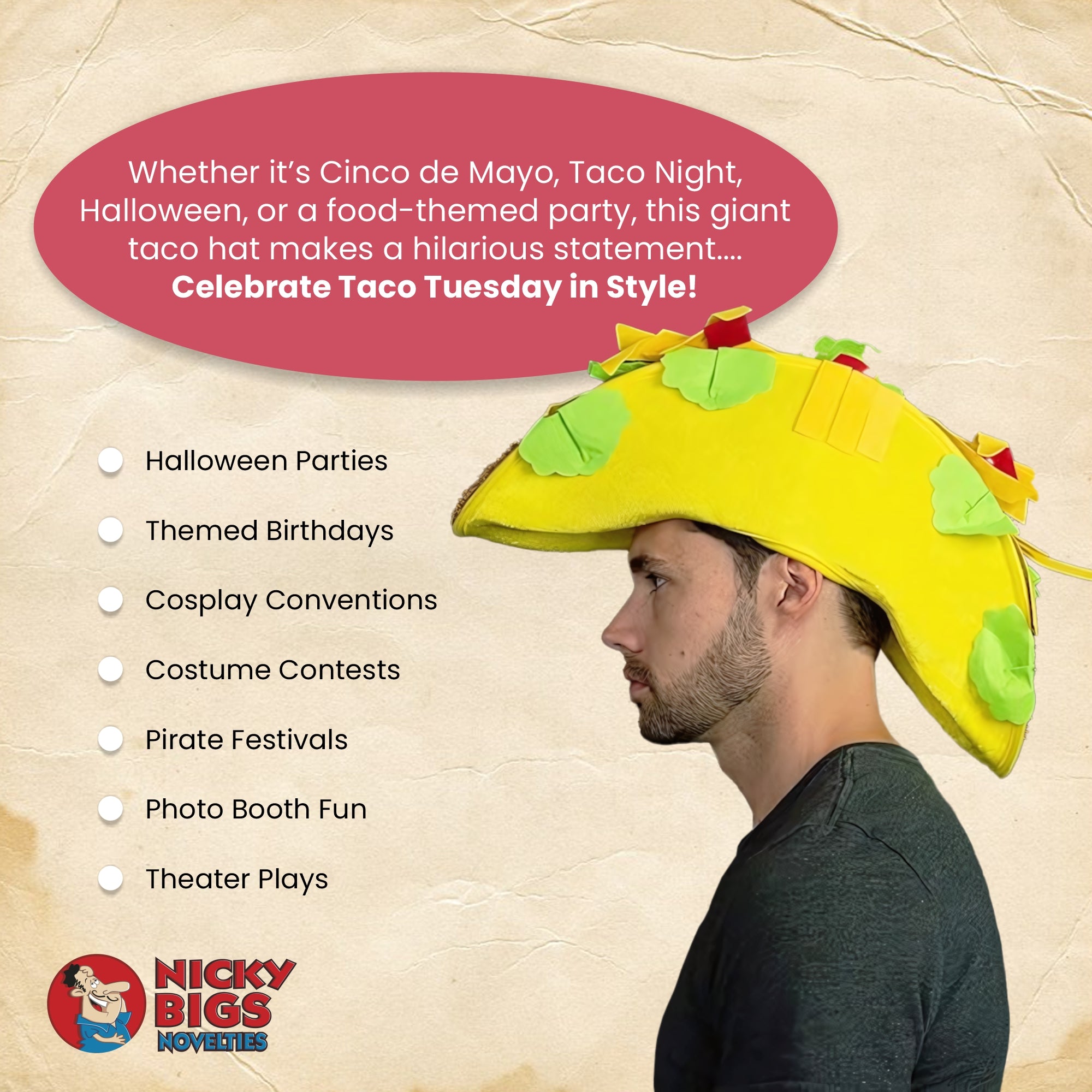 Lightweight yet durable for all-day wear, this hat is ideal for cosplay conventions, theater plays, Halloween, food truck events, and pirate festivals alike. Recommended for ages 14 and up, itâs spot-clean only and best suited for fun-loving wearers who want to taco 'bout their love for food fashion. Make every moment taco-tastically unforgettable with this USA-made gem from Nicky Bigs Novelties, a brand owned by Marsinos Costumes, proudly serving party people for over a century.