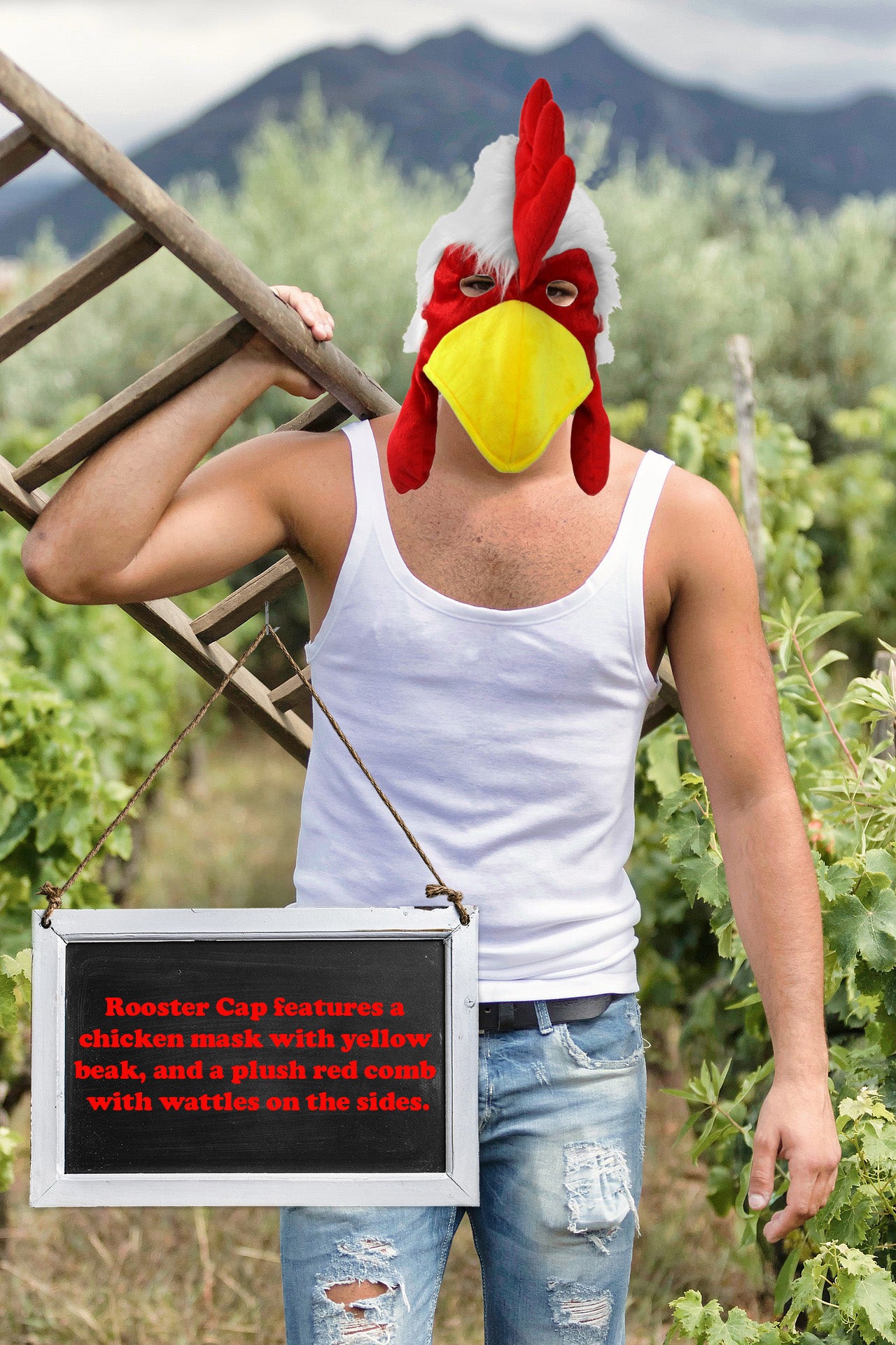 - Durable Construction: Made from high-quality materials for lasting wear and enjoyment. Rooster Cap features a chicken mask with red gizzard, yellow beak, and a red comb with wattles on the sides.