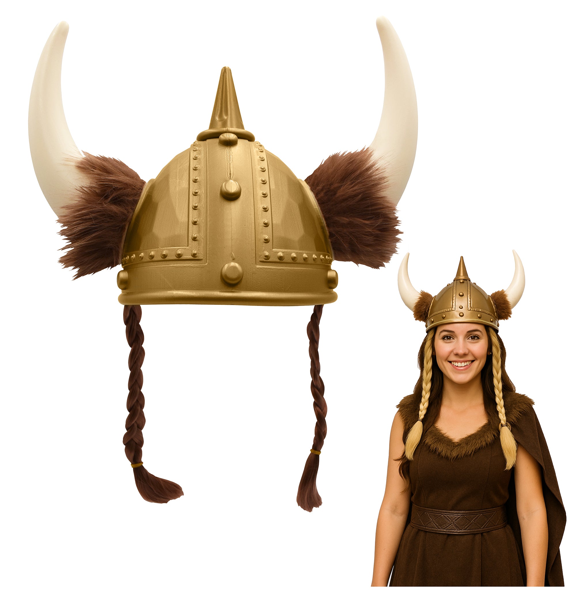 This season complete your look with this Adult Gold Viking Helmet With Horns and Braids. Lightweight and made of plastic. Each horned helmet has a gold dome spike with white horns.  Featuring a 13 inch wide horn to horn space, each horn is 9 inches tall to point. Accenting the viking accessory is blonde braids coming down the sides, each braid is about 8 inches long. Great for Men, Women, and Teens! Each medieval viking helmet  is sized about 58cm or  7 1/4". Made of durable plastic yet comfortable to wear. Perfect for Halloween, Cosplay, Theater and more! For ages 14 and older.