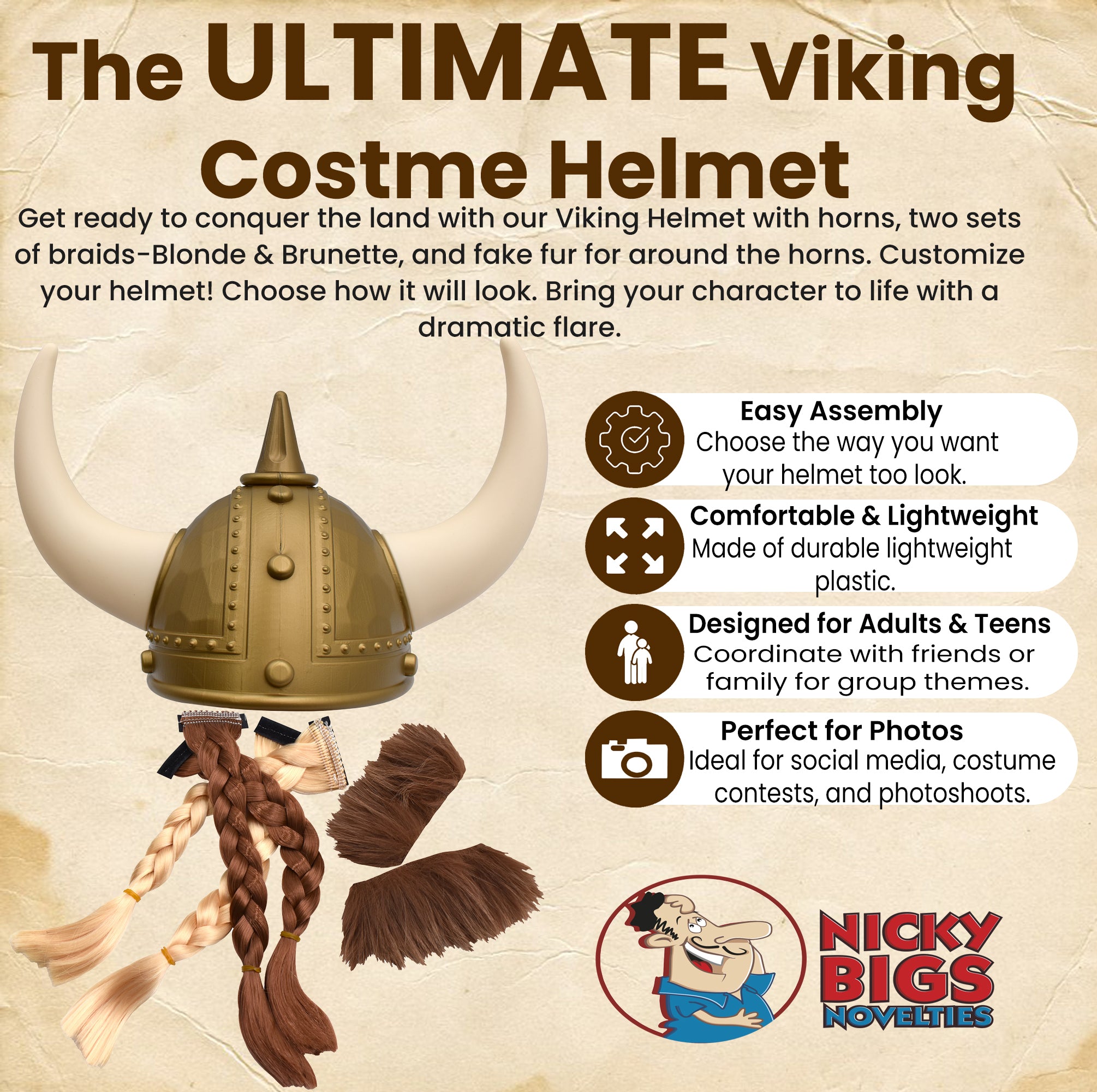 Nicky Bigs Novelties Gold Viking Helmet with Horns and Hair Braids for Adult Plastic Norse Barbarian Warrior Hat Medieval Vikings Costume Accessory Halloween Hats