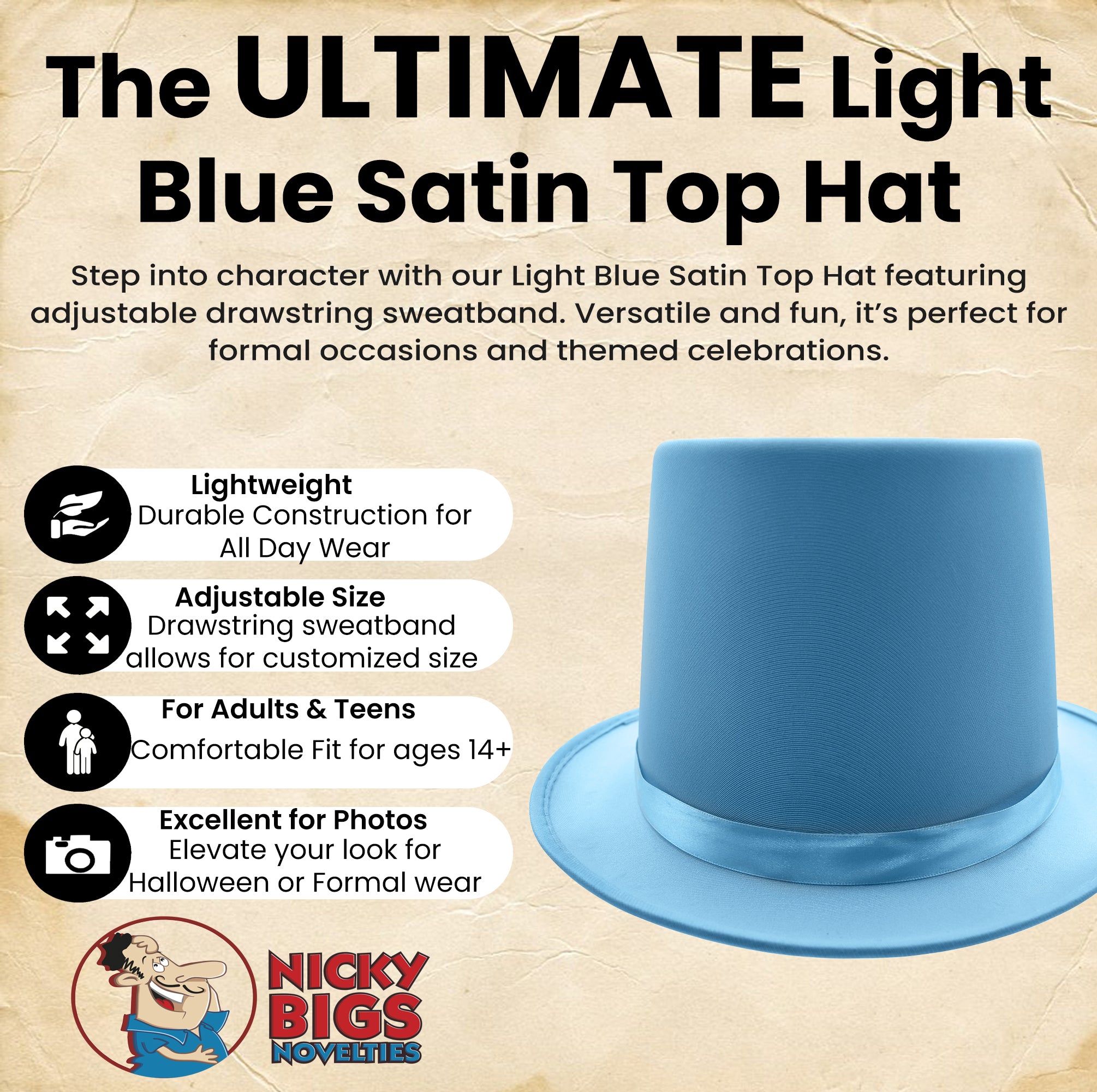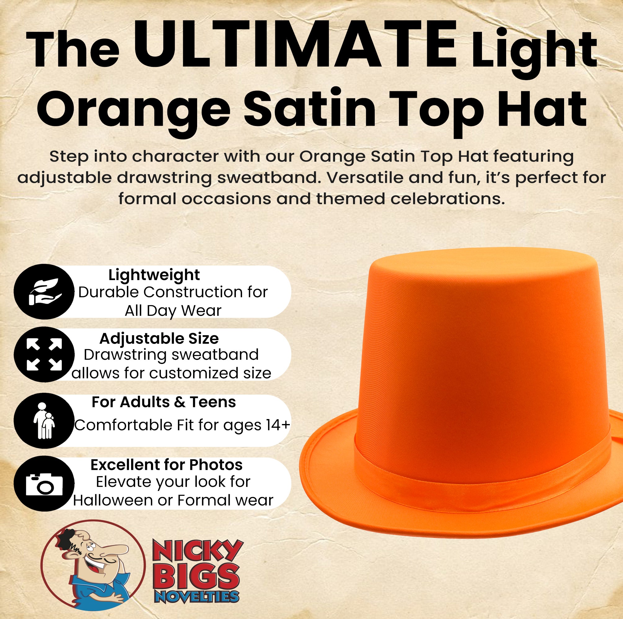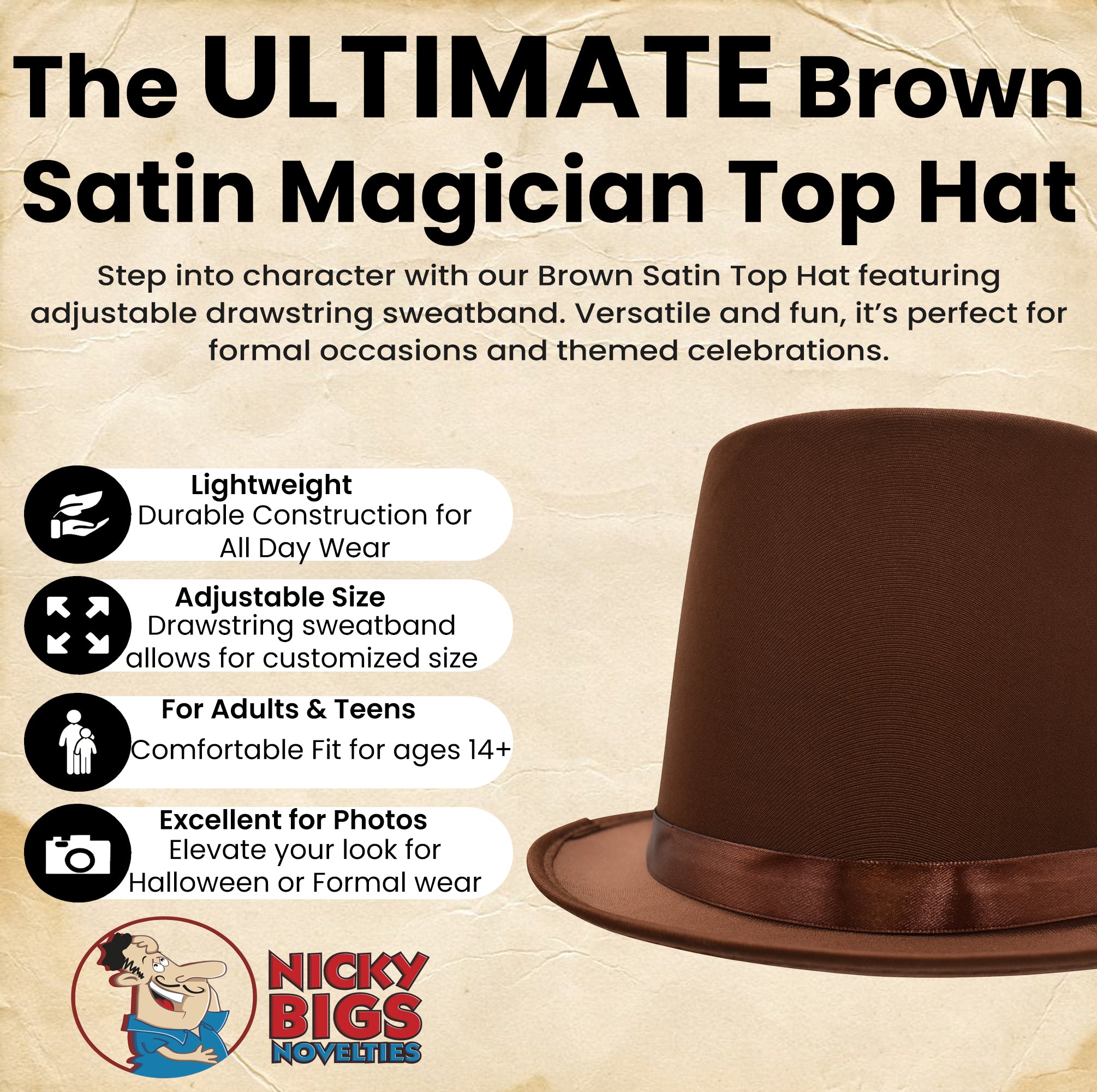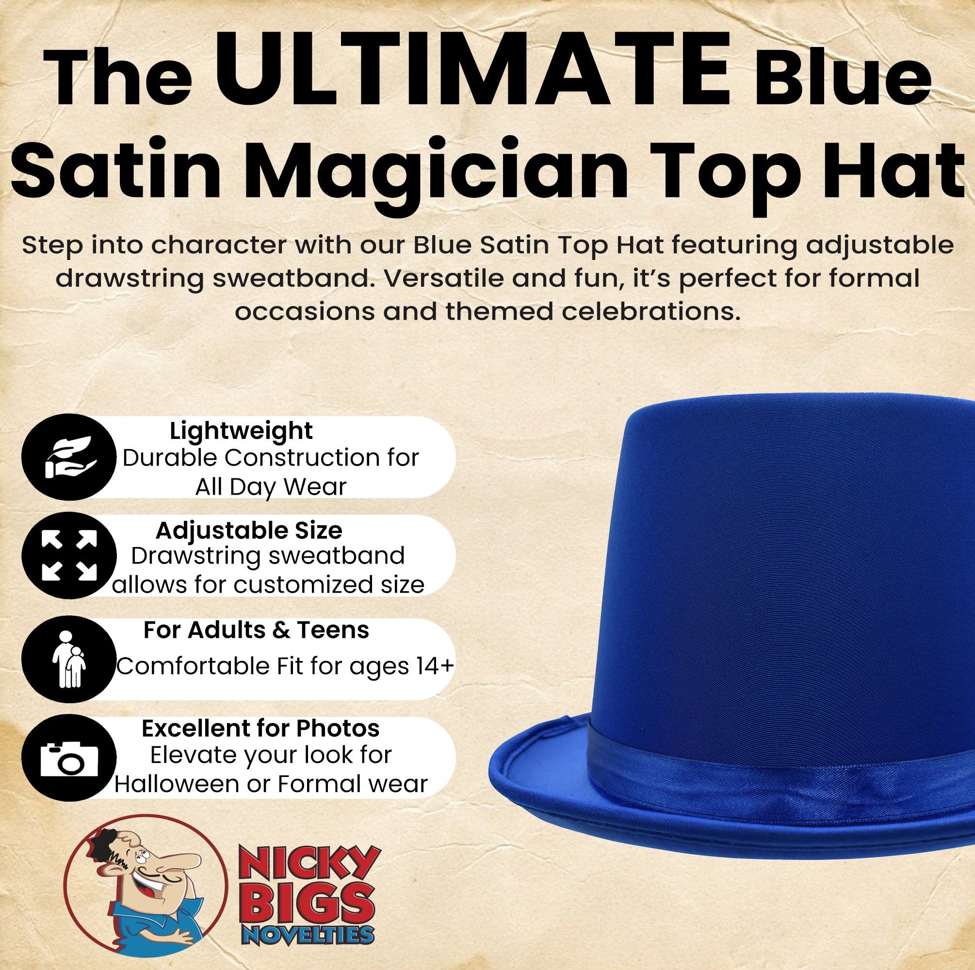 Elevate your look with the NickyâBigs Novelties Adult Colorful Satin Top Hat, a centerpiece of style from Marsinos Costumes, a beloved American, family-run brand with over a century of costume excellence. This vibrant, satin-wrapped top hat is available in eight standout colorsâred, blue, green, pink, purple, orange, black or brownâwith a matching satin band that catches the light and completes any ensemble.